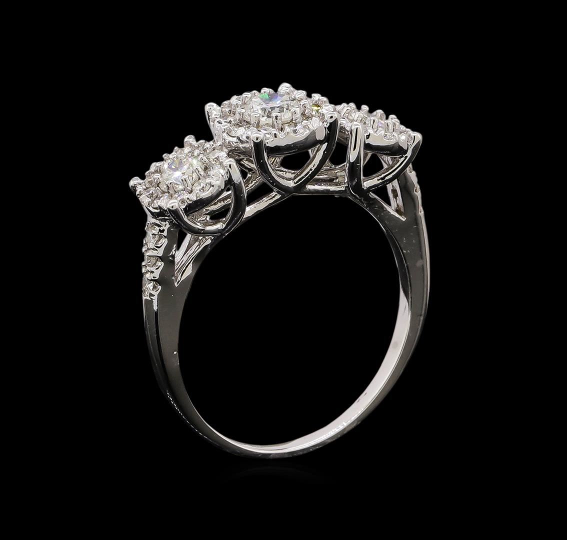 One electronically tested 14KT white gold ladies cast diamond engagement ring with a bright polish finish. Identified with markings of "14K". Condition is new. Containing: One prong set round brilliant cut diamond, measuring 4.10 - 4.10 x 2.46mm (depth est.) approximate weight of 0.25ct. Clarity: I-1. Color: I, Cut is Good. Two prong set round brilliant cut diamonds, measuring 3.50 - 3.50 x 2.10mm (depth est.) approximate total weight of 2 Stones = 0.31ct. Clarity: SI-2 to I-1. Color: J, Cut is Good. Thirty-One prong set round brilliant cut diamonds, measuring 1.40 - 1.30 x 0.81mm (depth est.) approximate total weight of 31 Stones = 0.28ct. Clarity: SI-2 to I-1. Color: I - J, Cut is Good. All diamonds are graded in the mounting, unless otherwise stated. Total Weight of Diamonds 0.85ct. Total Weight of Engagement Ring 4.10 grams. GGL Appraised at $3,140.00.