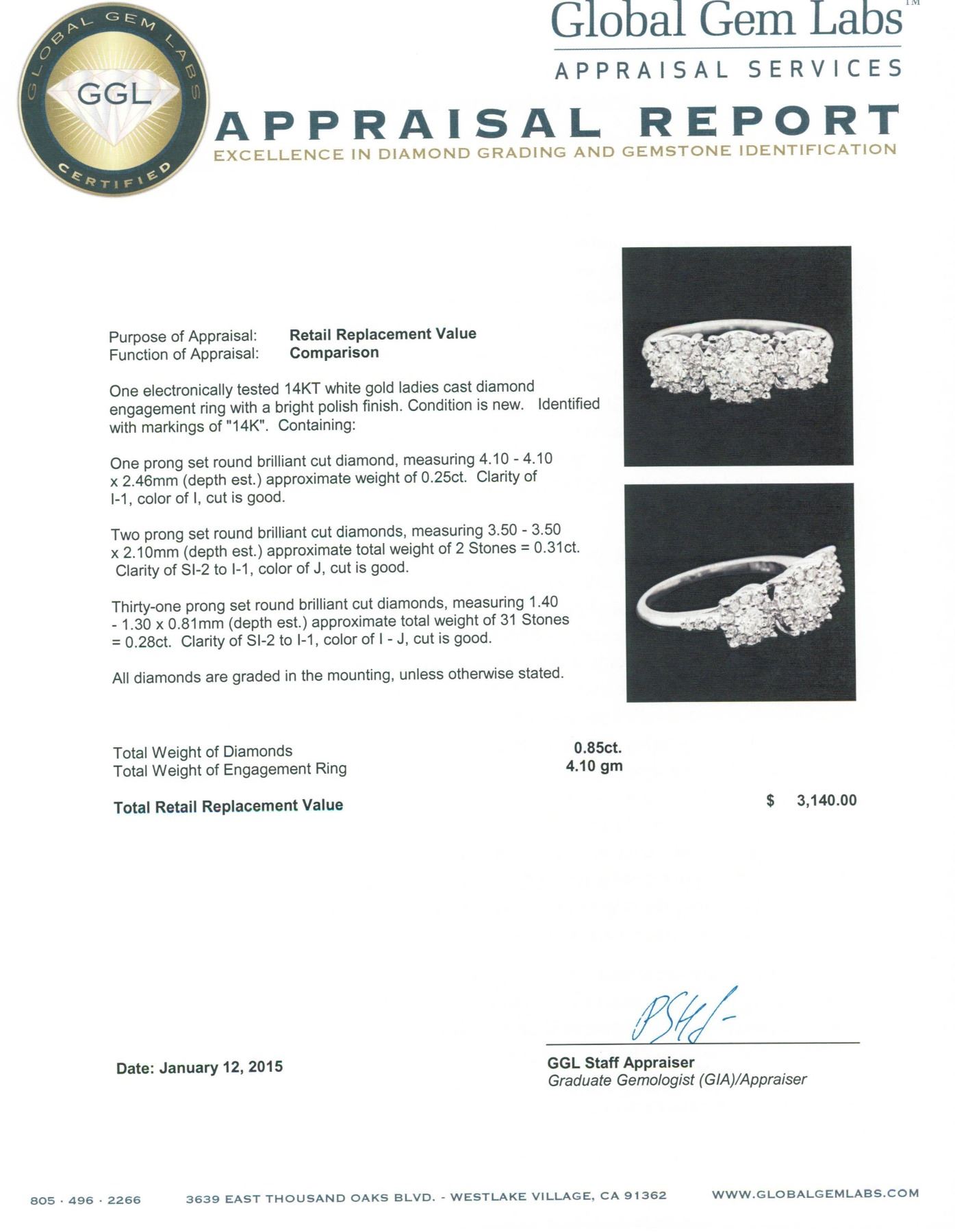 One electronically tested 14KT white gold ladies cast diamond engagement ring with a bright polish finish. Identified with markings of "14K". Condition is new. Containing: One prong set round brilliant cut diamond, measuring 4.10 - 4.10 x 2.46mm (depth est.) approximate weight of 0.25ct. Clarity: I-1. Color: I, Cut is Good. Two prong set round brilliant cut diamonds, measuring 3.50 - 3.50 x 2.10mm (depth est.) approximate total weight of 2 Stones = 0.31ct. Clarity: SI-2 to I-1. Color: J, Cut is Good. Thirty-One prong set round brilliant cut diamonds, measuring 1.40 - 1.30 x 0.81mm (depth est.) approximate total weight of 31 Stones = 0.28ct. Clarity: SI-2 to I-1. Color: I - J, Cut is Good. All diamonds are graded in the mounting, unless otherwise stated. Total Weight of Diamonds 0.85ct. Total Weight of Engagement Ring 4.10 grams. GGL Appraised.