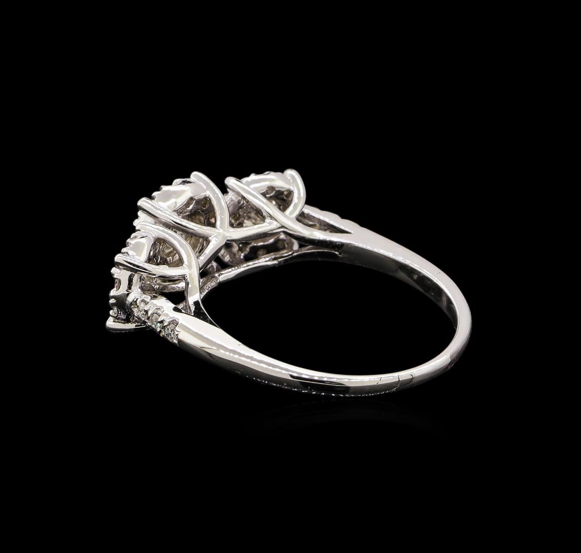 One electronically tested 14KT white gold ladies cast diamond engagement ring with a bright polish finish. Identified with markings of "14K". Condition is new. Containing: One prong set round brilliant cut diamond, measuring 4.10 - 4.10 x 2.46mm (depth est.) approximate weight of 0.25ct. Clarity: I-1. Color: I, Cut is Good. Two prong set round brilliant cut diamonds, measuring 3.50 - 3.50 x 2.10mm (depth est.) approximate total weight of 2 Stones = 0.31ct. Clarity: SI-2 to I-1. Color: J, Cut is Good. Thirty-One prong set round brilliant cut diamonds, measuring 1.40 - 1.30 x 0.81mm (depth est.) approximate total weight of 31 Stones = 0.28ct. Clarity: SI-2 to I-1. Color: I - J, Cut is Good. All diamonds are graded in the mounting, unless otherwise stated. Total Weight of Diamonds 0.85ct. Total Weight of Engagement Ring 4.10 grams. GGL Appraised.