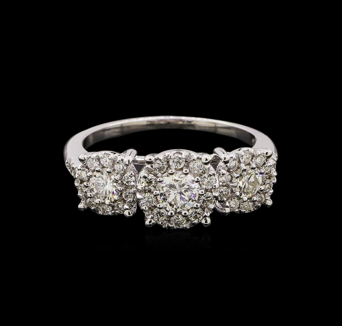 One electronically tested 14KT white gold ladies cast diamond engagement ring with a bright polish finish. Identified with markings of "14K". Condition is new. Containing: One prong set round brilliant cut diamond, measuring 4.10 - 4.10 x 2.46mm (depth est.) approximate weight of 0.25ct. Clarity: I-1. Color: I, Cut is Good. Two prong set round brilliant cut diamonds, measuring 3.50 - 3.50 x 2.10mm (depth est.) approximate total weight of 2 Stones = 0.31ct. Clarity: SI-2 to I-1. Color: J, Cut is Good. Thirty-One prong set round brilliant cut diamonds, measuring 1.40 - 1.30 x 0.81mm (depth est.) approximate total weight of 31 Stones = 0.28ct. Clarity: SI-2 to I-1. Color: I - J, Cut is Good. All diamonds are graded in the mounting, unless otherwise stated. Total Weight of Diamonds 0.85ct. Total Weight of Engagement Ring 4.10 grams. GGL Appraised.