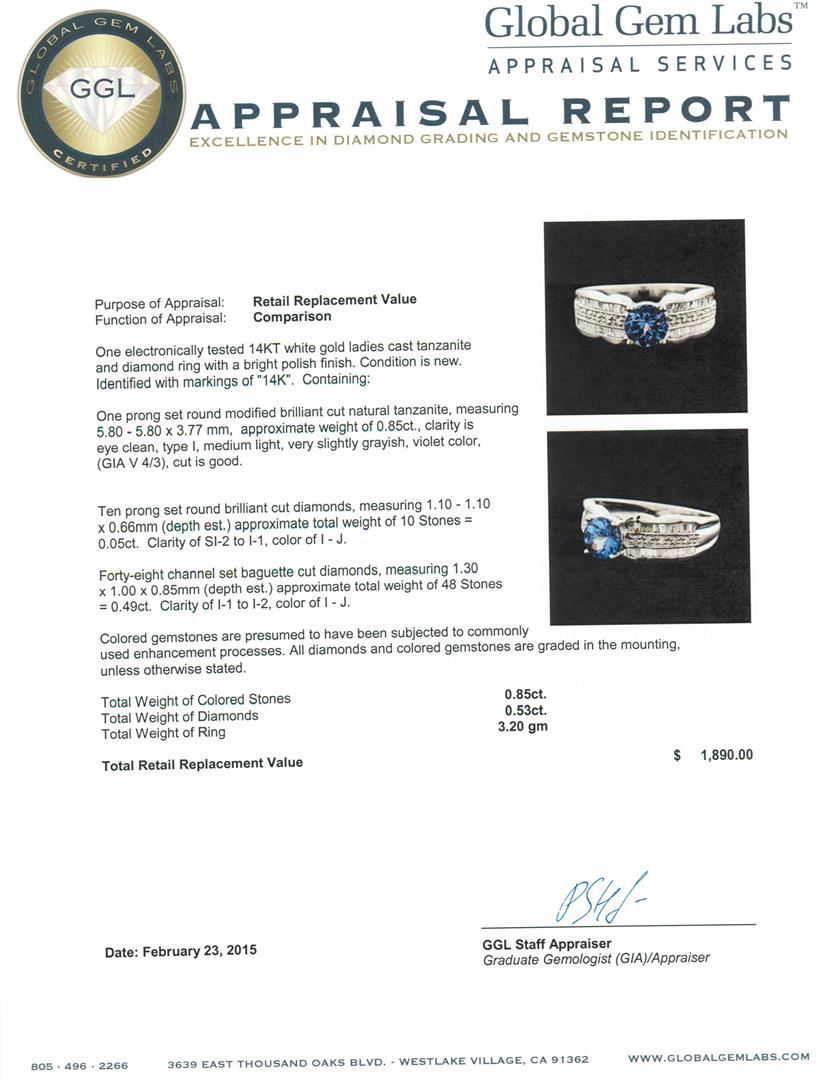 One electronically tested 14KT white gold ladies cast tanzanite and diamond ring with a bright polish finish. Identified with markings of "14K". Condition is new. Containing: One prong set round modified brilliant cut natural tanzanite, measuring 5.80 - 5.80 x 3.77 mm, approximate weight of 0.85ct., clarity is eye clean, type I, medium light, very slightly grayish, violet color, (GIA V 4/3), cut is good. Ten prong set round brilliant cut diamonds, measuring 1.10 - 1.10 x 0.66mm (depth est.) approximate total weight of 10 Stones = 0.05ct. Clarity: SI-2 to I-1. Color: I - J. Forty-Eight channel set baguette cut diamonds, measuring 1.30 x 1.00 x 0.85mm (depth est.) approximate total weight of 48 Stones = 0.49ct. Clarity: I-1 to I-2. Color: I - J. Colored gemstones are presumed to have been subjected to commonly used enhancement processes. All diamonds and colored gemstones are graded in the mounting, unless otherwise stated. Total Weight of Colored Stones 0.85ct. Total Weight of Diamonds 0.53ct. Total Weight of Ring 3.20 grams. GGL Appraised at $1,890.00.