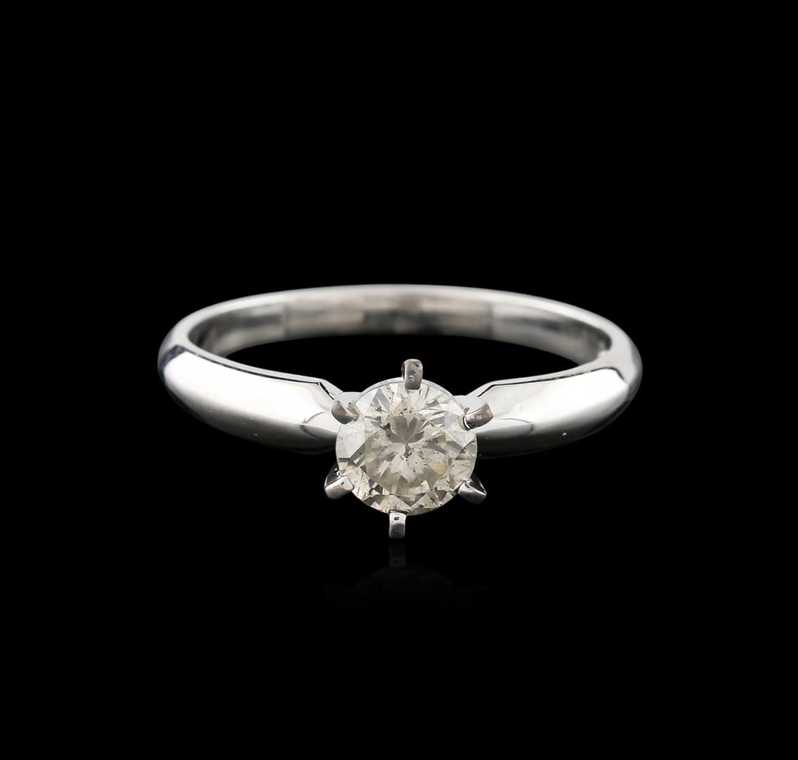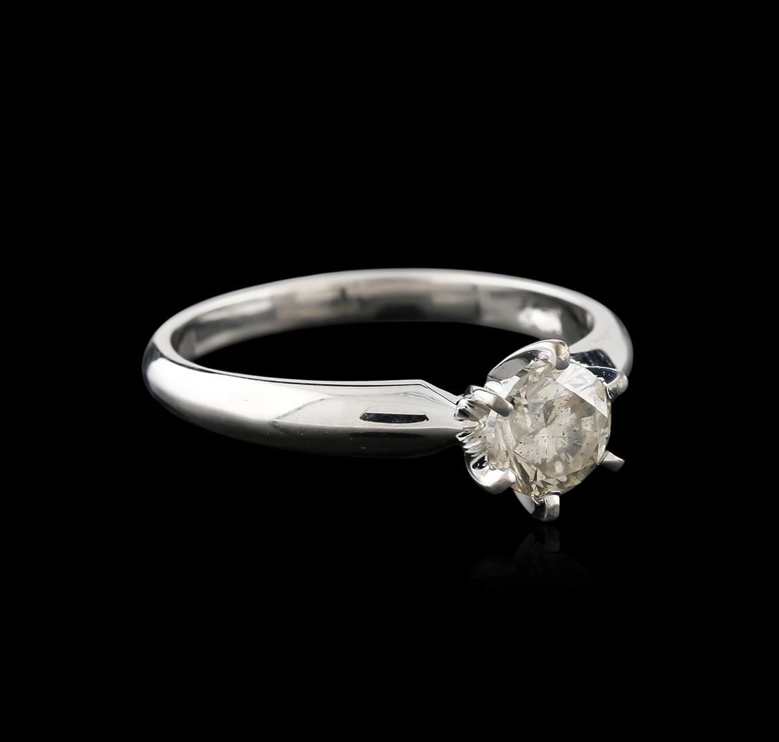 One electronically tested 14KT white gold ladies cast diamond solitaire ring with a half round shank with a bright polish finish. Identified with markings of "14K". Condition is new. Containing: One prong set round brilliant cut diamond, measuring 5.70 - 5.70 x 3.42mm (depth est.) exact weight 0.85ct. Clarity: I-2. Color: K, Cut is Good. Diamonds are graded in the mounting, unless otherwise stated. Total Weight of Diamonds 0.85ct. Total Weight of Solitaire Ring 2.70 grams. GGL Appraised at $1,460.00.