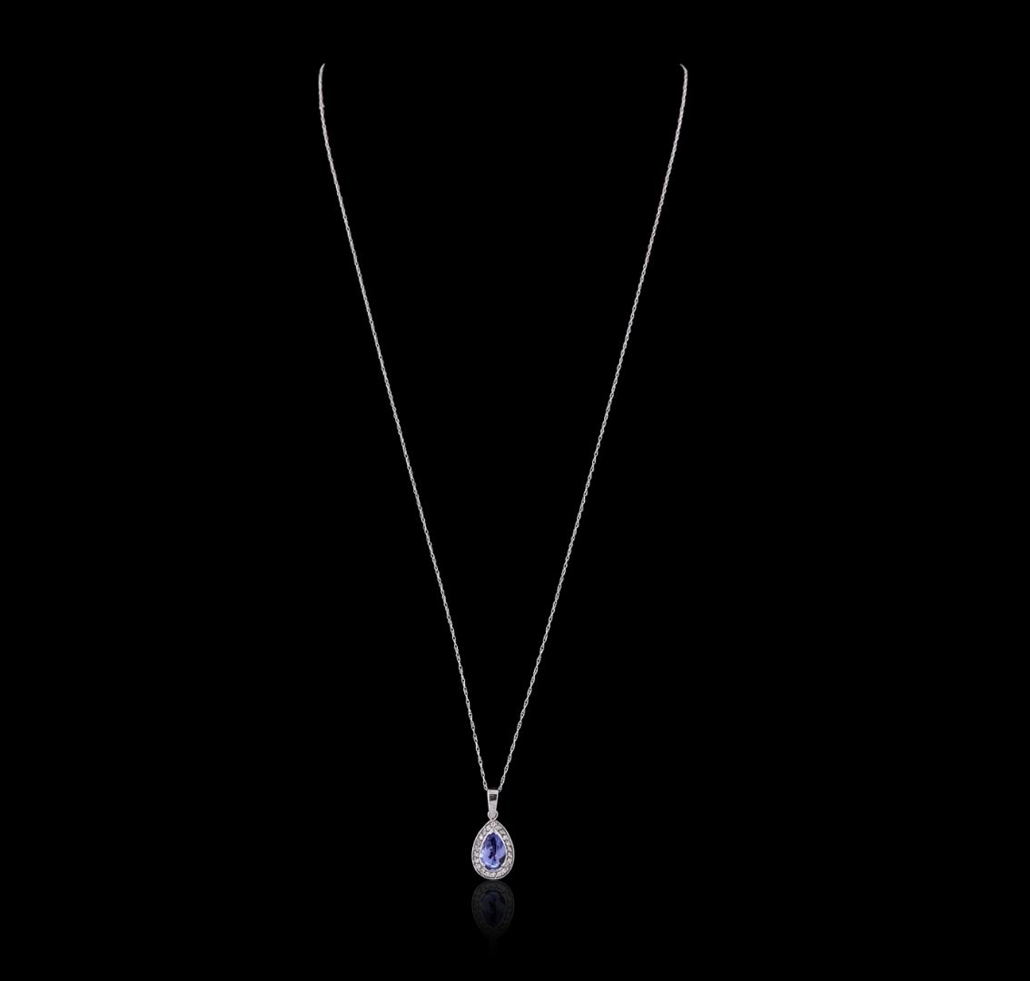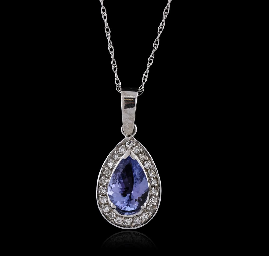 One pendant with chain featuring: 14KT white gold with a total weight of 2.30 grams, tanzanite with a total weight of 0.85ct, and diamonds with a total weight of 0.15ctw.