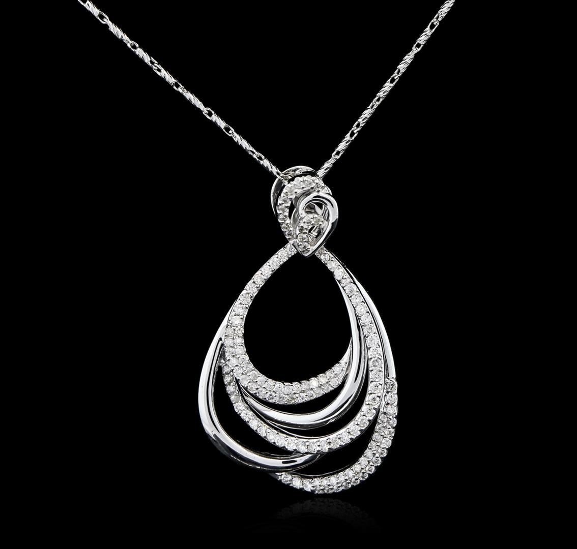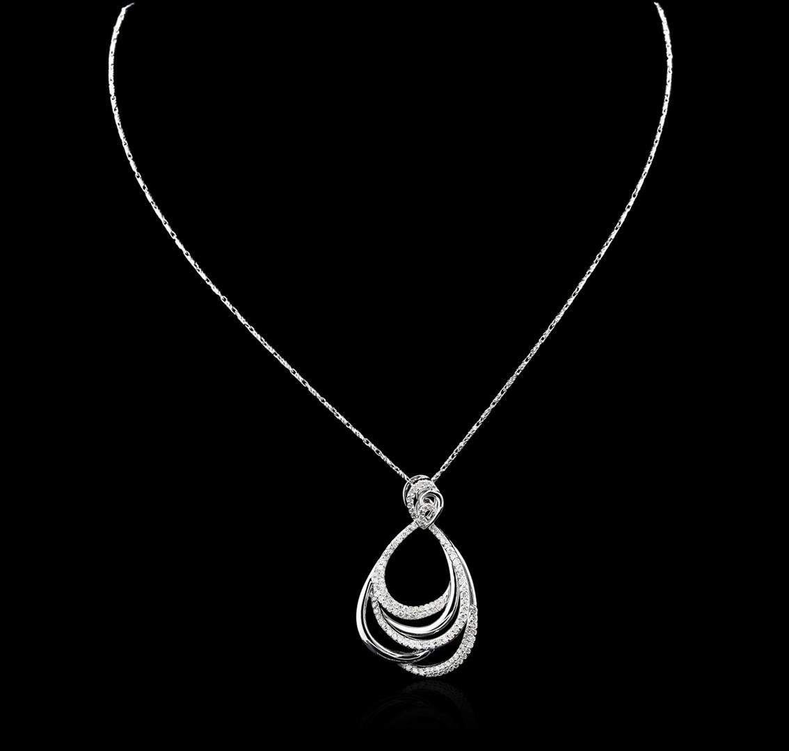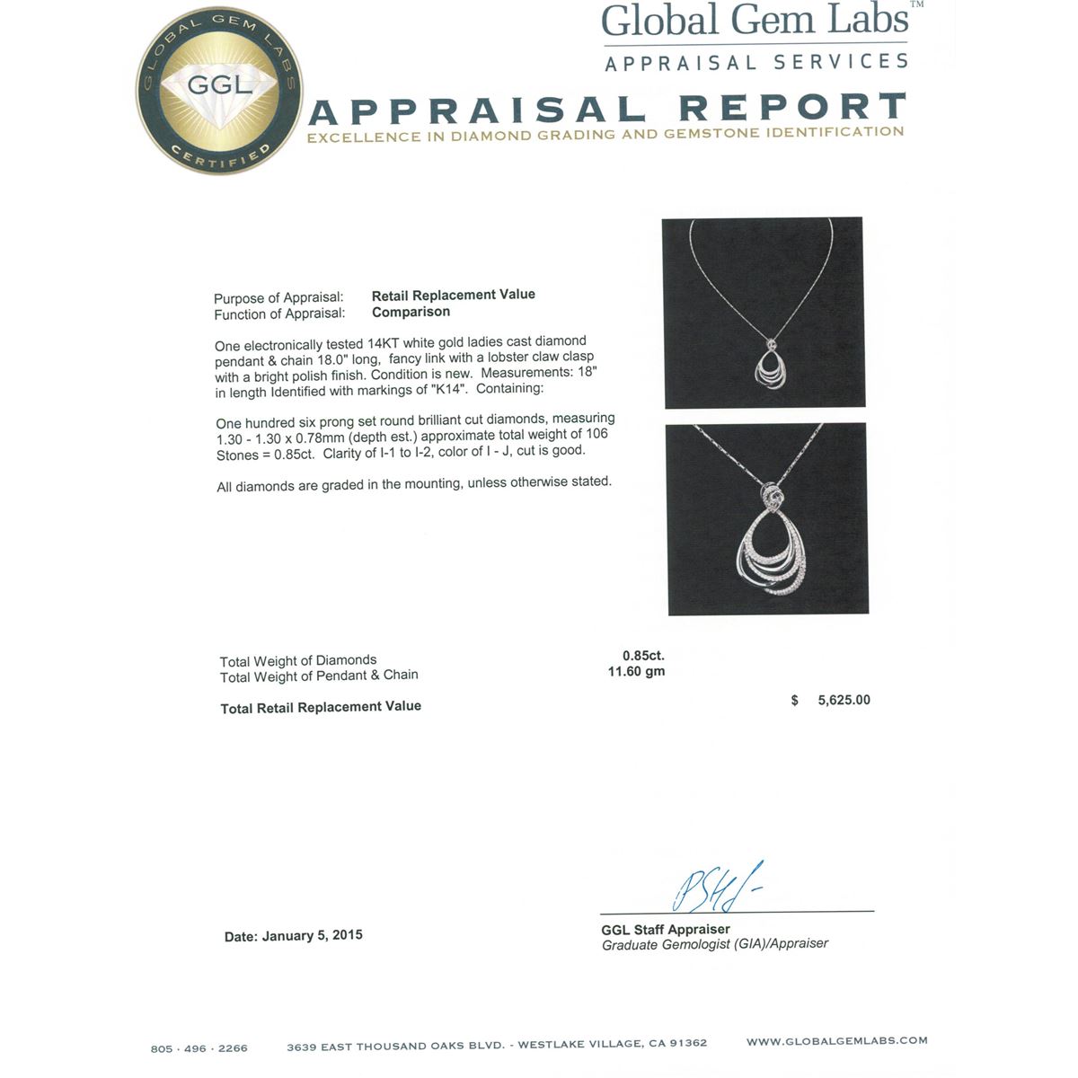 One electronically tested 14KT white gold ladies cast diamond pendant & chain 18.0" long, fancy link with a lobster claw clasp with a bright polish finish. Measurements: 18" in length Identified with markings of "K14". Condition is new. Containing: One Hundred Six prong set round brilliant cut diamonds, measuring 1.30 - 1.30 x 0.78mm (depth est.) approximate total weight of 106 Stones = 0.85ct. Clarity: I-1 to I-2. Color: I - J, Cut is Good. All diamonds are graded in the mounting, unless otherwise stated. Total Weight of Diamonds 0.85ct. Total Weight of Pendant & Chain 11.60 grams. GGL Appraised at $5,625.00.