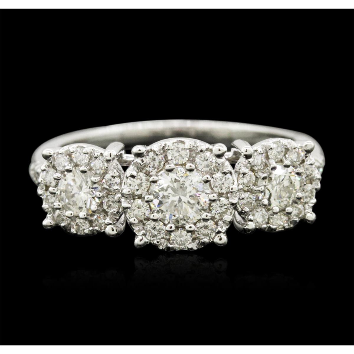 One electronically tested 14KT white gold ladies cast diamond engagement ring with a bright polish finish. Identified with markings of "14K". Condition is new. Containing: One prong set round brilliant cut diamond, measuring 4.10 - 4.10 x 2.46mm (depth est.) approximate weight of 0.25ct. Clarity: I-1. Color: I, Cut is Good. Two prong set round brilliant cut diamonds, measuring 3.50 - 3.50 x 2.10mm (depth est.) approximate total weight of 2 Stones = 0.31ct. Clarity: SI-2 to I-1. Color: J, Cut is Good. Thirty-One prong set round brilliant cut diamonds, measuring 1.40 - 1.30 x 0.81mm (depth est.) approximate total weight of 31 Stones = 0.28ct. Clarity: SI-2 to I-1. Color: I - J, Cut is Good. All diamonds are graded in the mounting, unless otherwise stated. Total Weight of Diamonds 0.85ct. Total Weight of Engagement Ring 4.10 grams. GGL Appraised at $3,140.00.