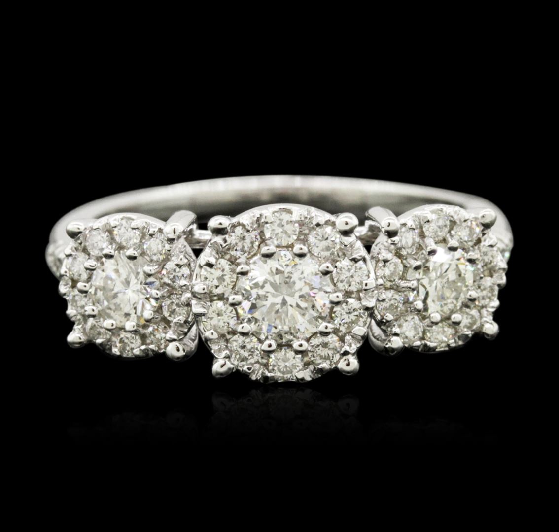 One electronically tested 14KT white gold ladies cast diamond engagement ring with a bright polish finish. Identified with markings of "14K". Condition is new. Containing: One prong set round brilliant cut diamond, measuring 4.10 - 4.10 x 2.46mm (depth est.) approximate weight of 0.25ct. Clarity: I-1. Color: I, Cut is Good. Two prong set round brilliant cut diamonds, measuring 3.50 - 3.50 x 2.10mm (depth est.) approximate total weight of 2 Stones = 0.31ct. Clarity: SI-2 to I-1. Color: J, Cut is Good. Thirty-One prong set round brilliant cut diamonds, measuring 1.40 - 1.30 x 0.81mm (depth est.) approximate total weight of 31 Stones = 0.28ct. Clarity: SI-2 to I-1. Color: I - J, Cut is Good. All diamonds are graded in the mounting, unless otherwise stated. Total Weight of Diamonds 0.85ct. Total Weight of Engagement Ring 4.10 grams. GGL Appraised at $3,140.00.