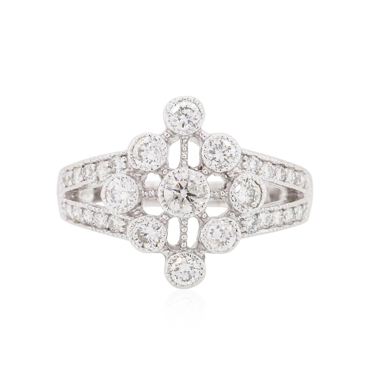 One electronically tested 14KT white gold ladies cast diamond ring with a split shoulder shank with a bright polish finish. Identified with markings of "14K". Condition is new. Containing: Nine gypsy set round brilliant cut diamonds, measuring 3.00 - 2.50 x 1.65mm (depth est.) approximate total weight of 9 Stones = 0.69ct. Clarity: SI-1. Color: I - J, Cut is Good. Thirteen prong set round brilliant cut diamonds, measuring 1.50 - 1.50 x 0.90mm (depth est.) approximate total weight of 13 Stones = 0.16ct. Clarity: SI-1 to SI-2. Color: I - J, Cut is Good. All diamonds are graded in the mounting, unless otherwise stated. Total Weight of Diamonds 0.85ct. Total Weight of Ring 5.60 grams. GGL Appraised at $3,765.00.
