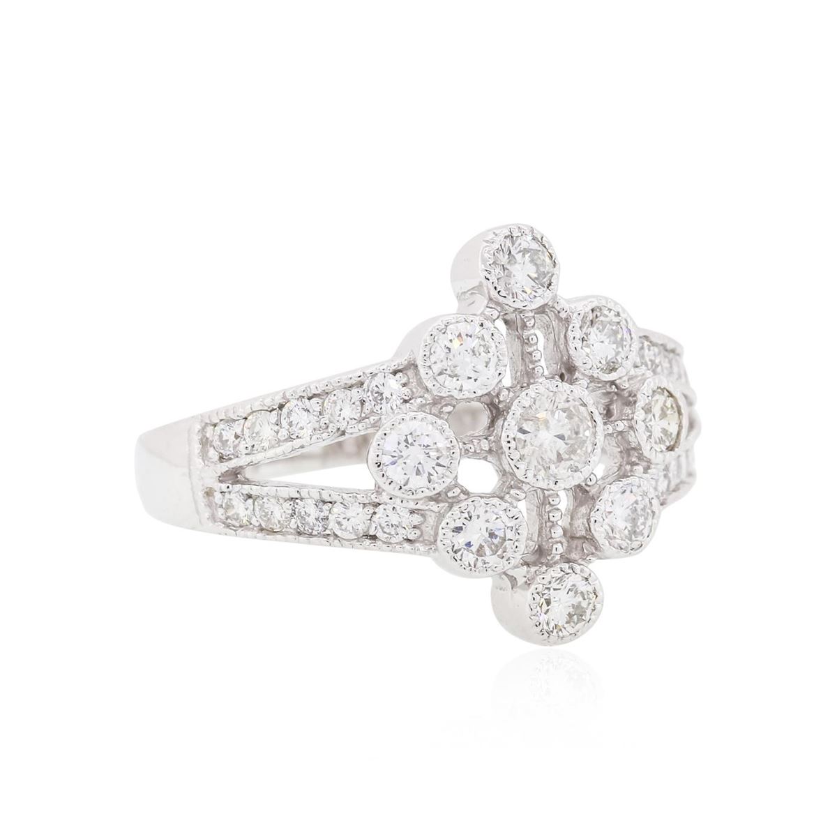 One electronically tested 14KT white gold ladies cast diamond ring with a split shoulder shank with a bright polish finish. Identified with markings of "14K". Condition is new. Containing: Nine gypsy set round brilliant cut diamonds, measuring 3.00 - 2.50 x 1.65mm (depth est.) approximate total weight of 9 Stones = 0.69ct. Clarity: SI-1. Color: I - J, Cut is Good. Thirteen prong set round brilliant cut diamonds, measuring 1.50 - 1.50 x 0.90mm (depth est.) approximate total weight of 13 Stones = 0.16ct. Clarity: SI-1 to SI-2. Color: I - J, Cut is Good. All diamonds are graded in the mounting, unless otherwise stated. Total Weight of Diamonds 0.85ct. Total Weight of Ring 5.60 grams. GGL Appraised at $3,765.00.