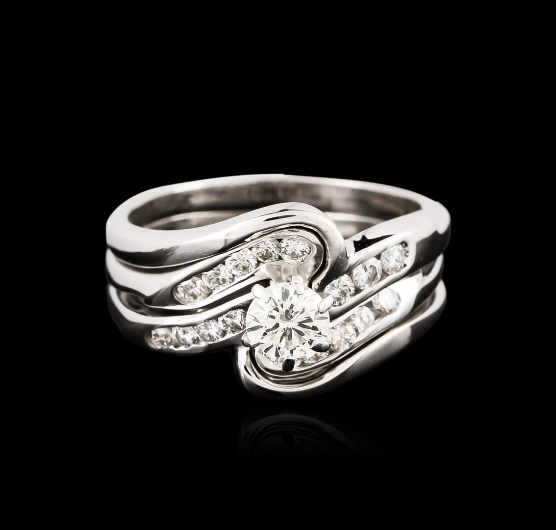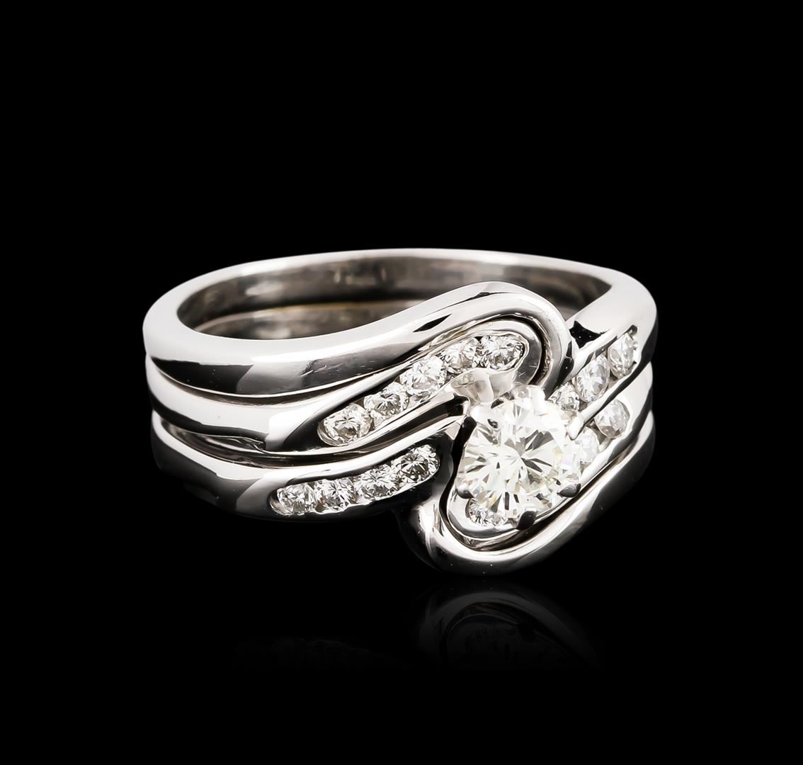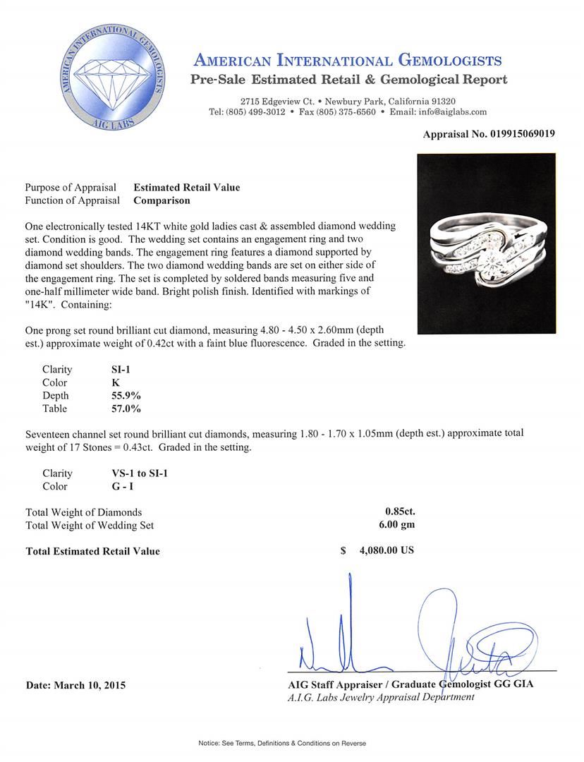 One electronically tested 14KT white gold ladies cast & assembled diamond wedding set. The wedding set contains an engagement ring and two diamond wedding bands. The engagement ring features a diamond supported by diamond set shoulders. The two diamond wedding bands are set on either side of the engagement ring. The set is completed by soldered bands measuring five and one-half millimeter wide band. Bright polish finish. Identified with markings of "14K". Condition is good. Containing: One prong set round brilliant cut diamond, measuring 4.80 - 4.50 x 2.60mm (depth est.) approximate weight of 0.42ct with a faint blue fluorescence. Graded in the setting. Clarity: SI-1. Color: 55.9%. Table 57.0%. Seventeen channel set round brilliant cut diamonds, measuring 1.80 - 1.70 x 1.05mm (depth est.) approximate total weight of 17 Stones = 0.43ct. Graded in the setting. Clarity: VS-1 to SI-1. Color: G - I. Total Weight of Diamonds 0.85ct. Total Weight of Wedding Set 6.00 grams. AIG Appraised at $4,080.00.