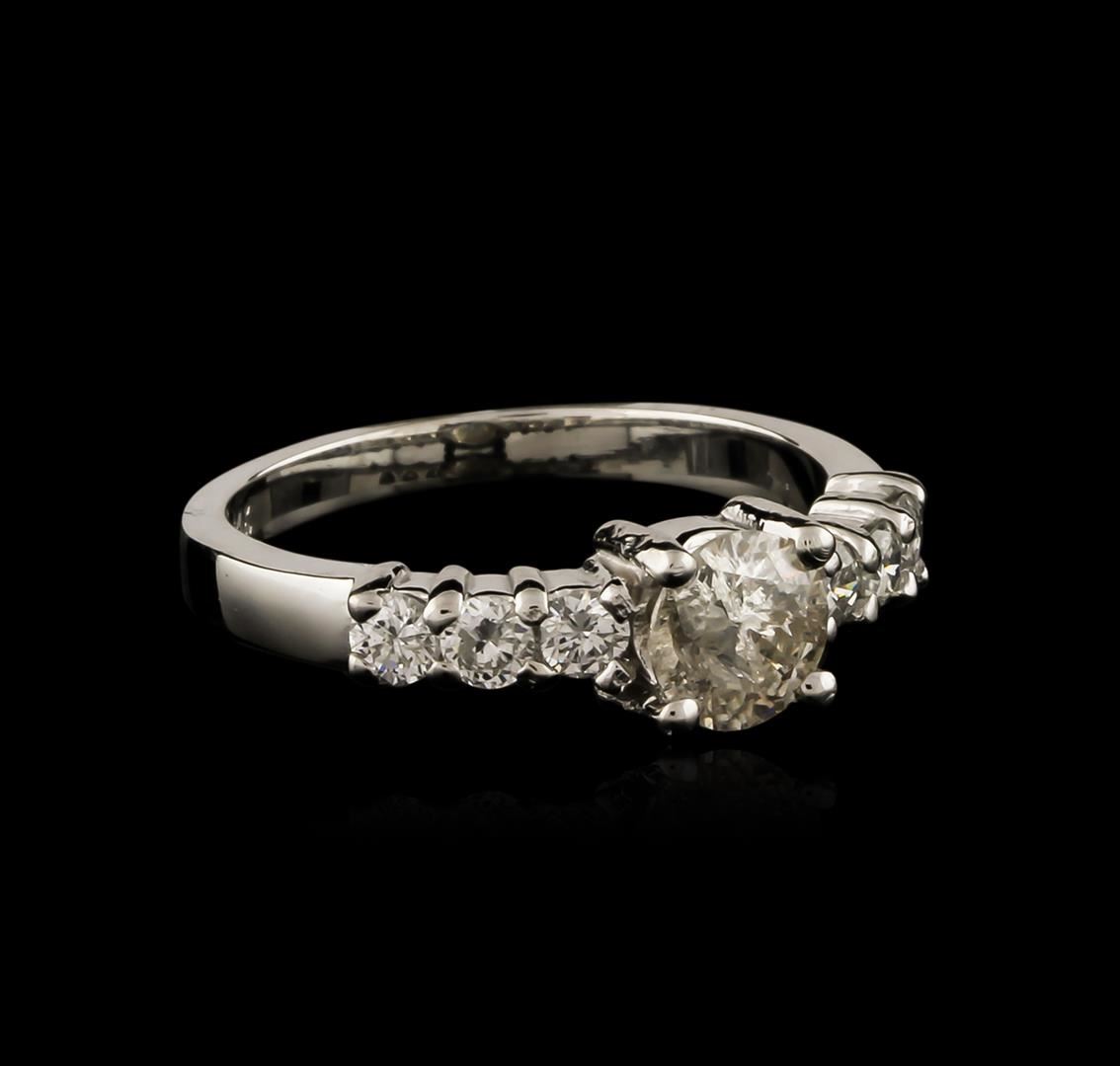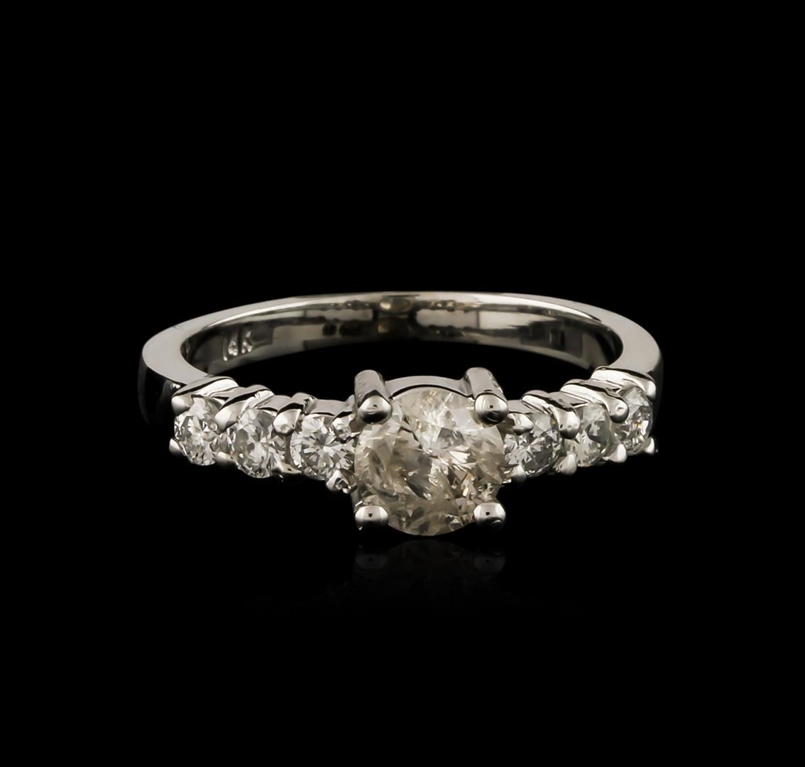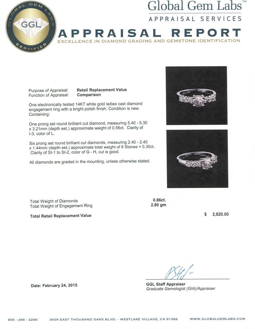 One electronically tested 14KT white gold ladies cast diamond engagement ring with a bright polish finish. Condition is new. Containing: One prong set round brilliant cut diamond, measuring 5.40 - 5.30 x 3.21mm (depth est.) approximate weight of 0.56ct. Clarity: I-3. Color: L. Six prong set round brilliant cut diamonds, measuring 2.40 - 2.40 x 1.44mm (depth est.) approximate total weight of 6 Stones = 0.30ct. Clarity: SI-1 to SI-2. Color: G - H, Cut is Good. All diamonds are graded in the mounting, unless otherwise stated. Total Weight of Diamonds 0.86ct. Total Weight of Engagement Ring 2.80 grams. GGL Appraised at $2,820.00.