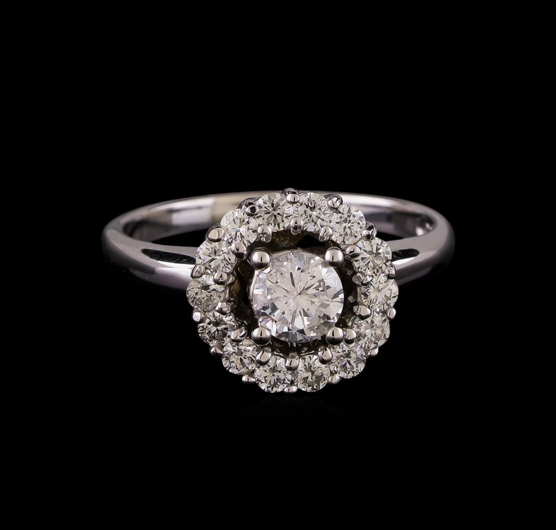 One electronically tested 14KT white gold ladies combination cast & assembled engagement ring with a flat shank with a bright polish finish. Identified with markings of "K14". Condition is new. Containing: One prong set round brilliant cut diamond, measuring 4.85 - 4.81 x 3.14mm (depth est.) approximate weight of 0.45ct. Clarity: I-1. Color: J, Cut is Good. Fourteen prong set round brilliant cut diamonds, measuring 2.00 - 2.00 x 1.20mm (depth est.) approximate total weight of 14 Stones = 0.41ct. Clarity: SI-1 to SI-2. Color: I, Cut is Good. All diamonds are graded in the mounting, unless otherwise stated. Total Weight of Diamonds 0.86ct. Total Weight of Ring 3.80 grams. GGL Appraised at $4,195.00.