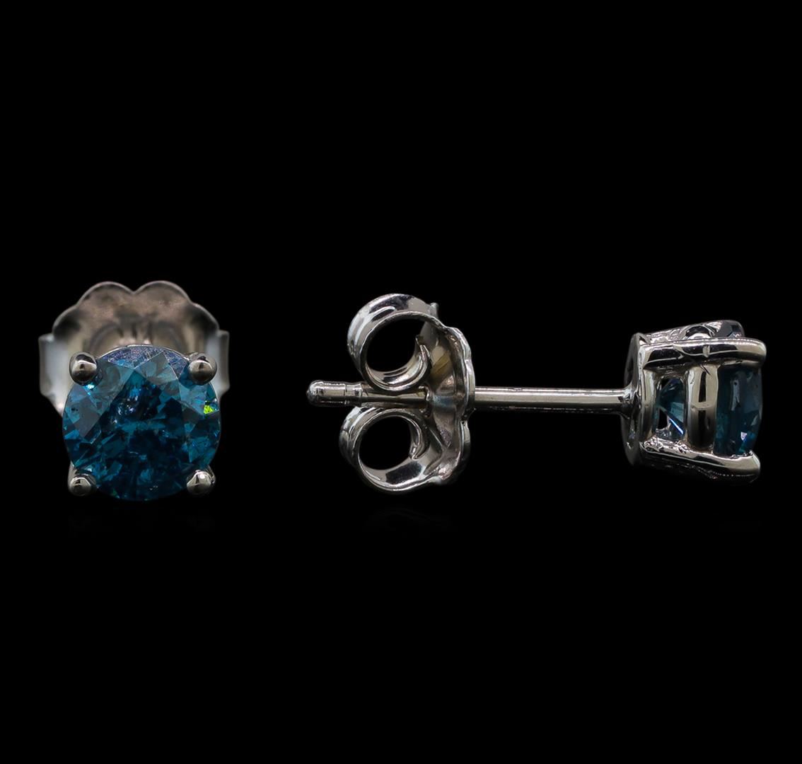 One pair electronically tested 14KT white gold ladies cast diamond stud earrings with friction posts with a bright polish finish. Identified with markings of "14K". Condition is new. Containing: Two prong set round brilliant cut diamonds, measuring 4.90 - 4.90 x 2.94mm (depth est.) approximate total weight of 2 Stones = 0.86ct. Clarity: I-2, Cut is Good. Color of the stones has been treated. Diamonds are graded in the mounting, unless otherwise stated. Total Weight of Diamonds 0.86ct. Total Weight of Stud Earrings 1.00 grams. GGL Appraised at $1,245.00.