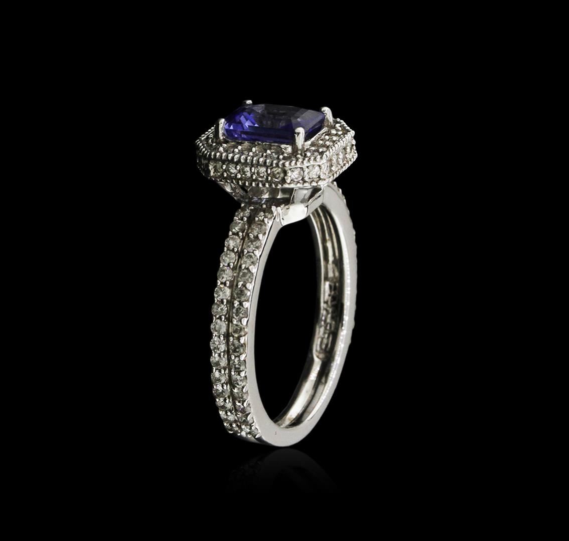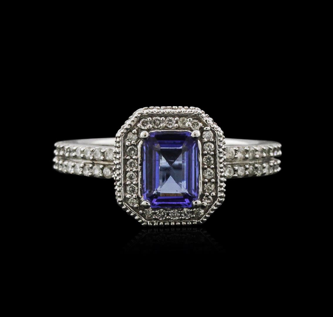 One electronically tested 14KT white gold ladies cast tanzanite and diamond ring with a split shank with a bright polish finish. Identified with markings of "14K". Condition is new. Containing: One prong set rectangular cushion modified brilliant cut bijoreve tanzanite, measuring 7.09 x 5.09 x 3.01mm, approximate weight of 0.86ct., clarity is eye clean, type I, medium, very slightly grayish, violet color, (GIA V 5/3), cut is good. One Hundred Two prong set round brilliant cut diamonds, measuring 1.30 - 1.30 x 0.78mm (depth est.) approximate total weight of 102 Stones = 0.82ct. Clarity of I-1 to I-3, Color of I - J, Cut is Good. All diamonds and colored gemstones are graded in the mounting, unless otherwise stated. Colored gemstones are presumed to have been subjected to commonly used enhancement processes. Total Weight of Colored Stones 0.86ct. Total Weight of Diamonds 0.82ct. Total Weight of Ring 5.20 grams. GGL Appraised at $3,035.00.