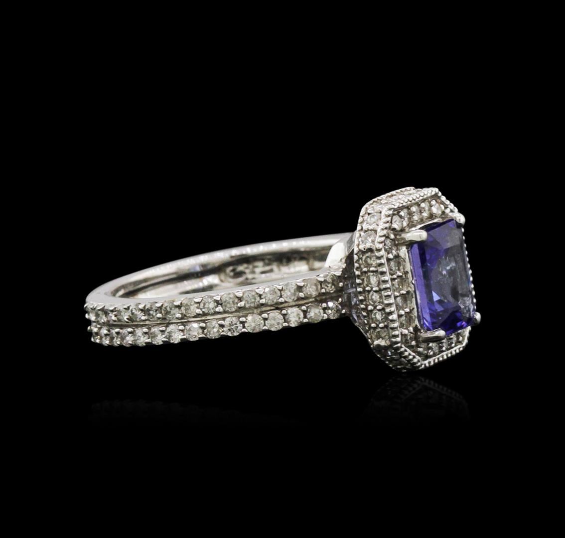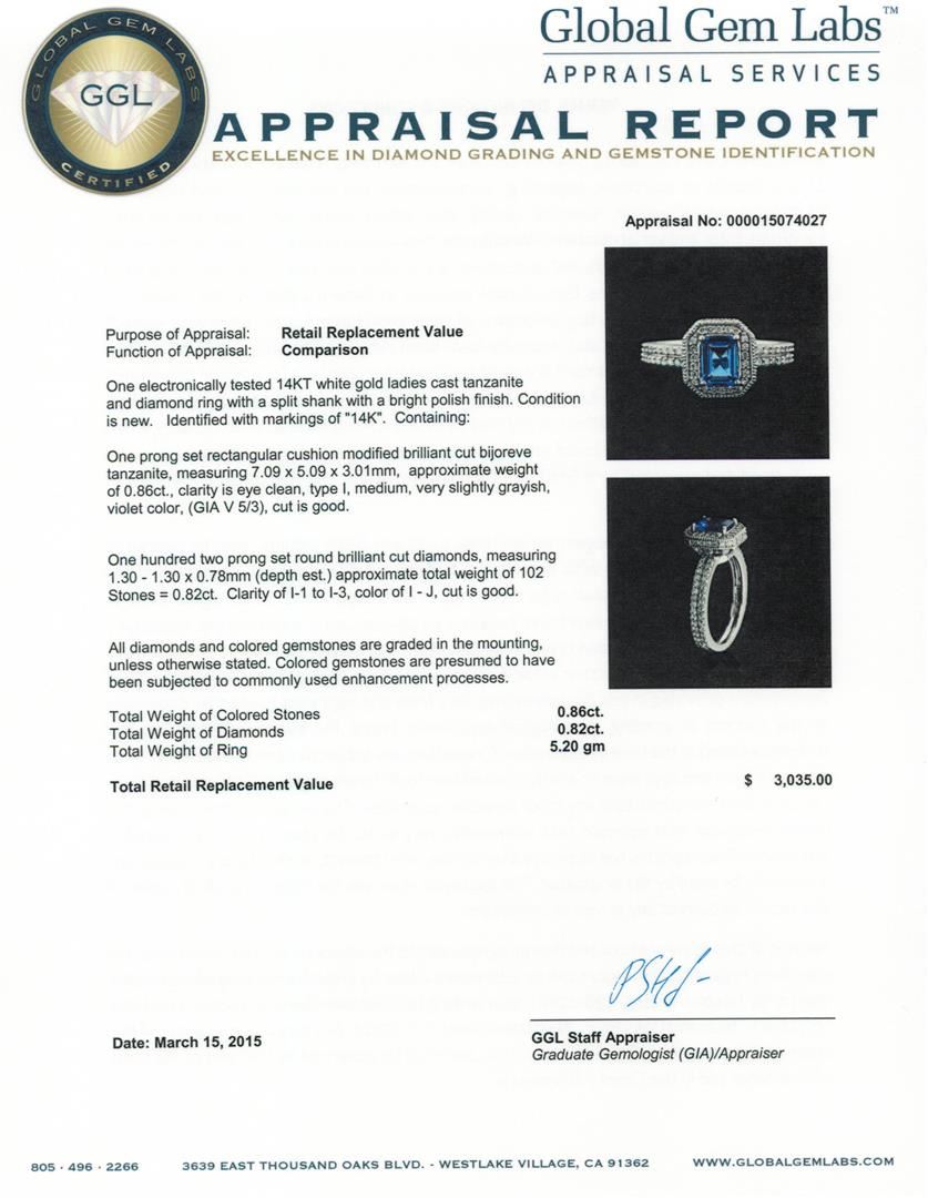 One electronically tested 14KT white gold ladies cast tanzanite and diamond ring with a split shank with a bright polish finish. Identified with markings of "14K". Condition is new. Containing: One prong set rectangular cushion modified brilliant cut bijoreve tanzanite, measuring 7.09 x 5.09 x 3.01mm, approximate weight of 0.86ct., clarity is eye clean, type I, medium, very slightly grayish, violet color, (GIA V 5/3), cut is good. One Hundred Two prong set round brilliant cut diamonds, measuring 1.30 - 1.30 x 0.78mm (depth est.) approximate total weight of 102 Stones = 0.82ct. Clarity of I-1 to I-3, Color of I - J, Cut is Good. All diamonds and colored gemstones are graded in the mounting, unless otherwise stated. Colored gemstones are presumed to have been subjected to commonly used enhancement processes. Total Weight of Colored Stones 0.86ct. Total Weight of Diamonds 0.82ct. Total Weight of Ring 5.20 grams. GGL Appraised at $3,035.00.