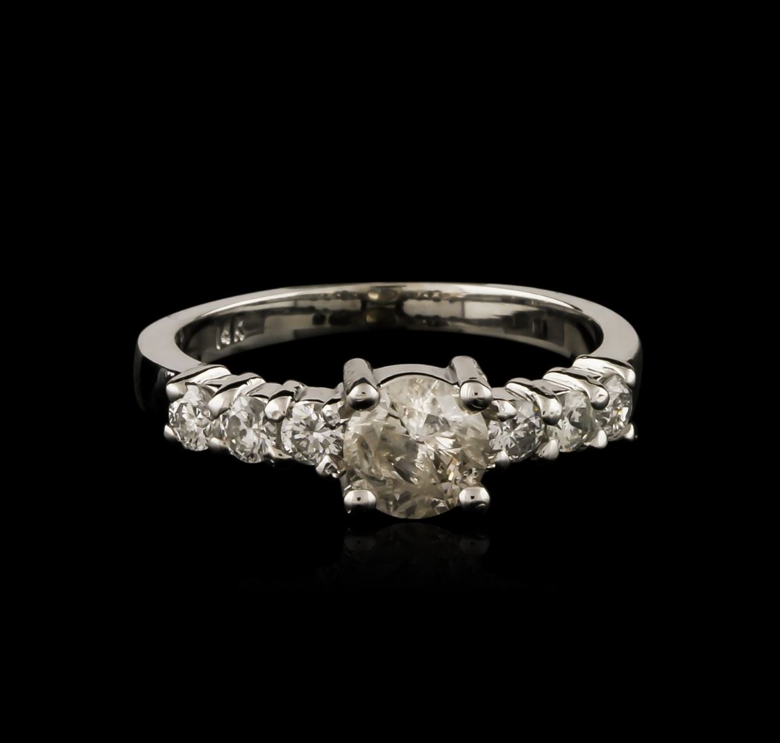 One electronically tested 14KT white gold ladies cast diamond engagement ring with a bright polish finish. Condition is new. Containing: One prong set round brilliant cut diamond, measuring 5.40 - 5.30 x 3.21mm (depth est.) approximate weight of 0.56ct. Clarity: I-3. Color: L. Six prong set round brilliant cut diamonds, measuring 2.40 - 2.40 x 1.44mm (depth est.) approximate total weight of 6 Stones = 0.30ct. Clarity: SI-1 to SI-2. Color: G - H, Cut is Good. All diamonds are graded in the mounting, unless otherwise stated. Total Weight of Diamonds 0.86ct. Total Weight of Engagement Ring 2.80 grams. GGL Appraised at $2,820.00.