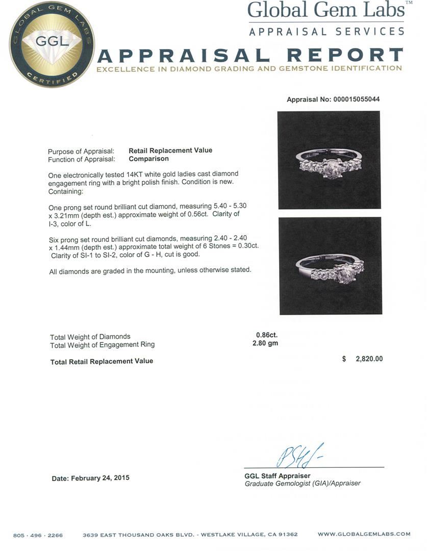 One electronically tested 14KT white gold ladies cast diamond engagement ring with a bright polish finish. Condition is new. Containing: One prong set round brilliant cut diamond, measuring 5.40 - 5.30 x 3.21mm (depth est.) approximate weight of 0.56ct. Clarity: I-3. Color: L. Six prong set round brilliant cut diamonds, measuring 2.40 - 2.40 x 1.44mm (depth est.) approximate total weight of 6 Stones = 0.30ct. Clarity: SI-1 to SI-2. Color: G - H, Cut is Good. All diamonds are graded in the mounting, unless otherwise stated. Total Weight of Diamonds 0.86ct. Total Weight of Engagement Ring 2.80 grams. GGL Appraised at $2,820.00.