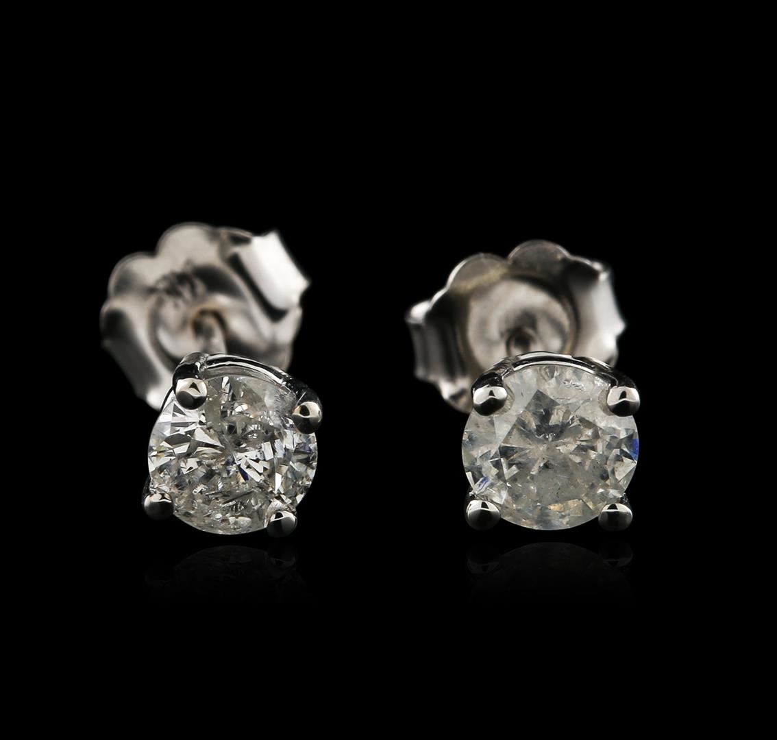 One pair electronically tested 14KT white gold ladies cast diamond stud earrings with friction posts with a bright polish finish. Identified with markings of "14K". Condition is new. Containing: Two prong set round brilliant cut diamonds, measuring 4.90 - 4.90 x 2.94mm (depth est.) approximate total weight of 2 Stones = 0.86ct. Clarity: I-2. Color: G - H, Cut is Good. Diamonds are graded in the mounting, unless otherwise stated. Total Weight of Diamonds 0.86ct. Total Weight of Stud Earrings 0.90 grams. GGL Appraised at $1,655.00.