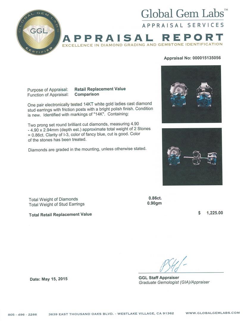 One pair electronically tested 14KT white gold ladies cast diamond stud earrings with friction posts with a bright polish finish. Identified with markings of "14K". Condition is new. Containing: Two prong set round brilliant cut diamonds, measuring 4.90 - 4.90 x 2.94mm (depth est.) approximate total weight of 2 Stones = 0.86ct. Clarity: I-3, Cut is Good. Color of the stones has been treated. Diamonds are graded in the mounting, unless otherwise stated. Total Weight of Diamonds 0.86ct. Total Weight of Stud Earrings 0.90 grams. GGL Appraised at $1,225.00.