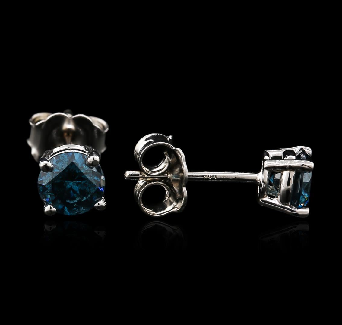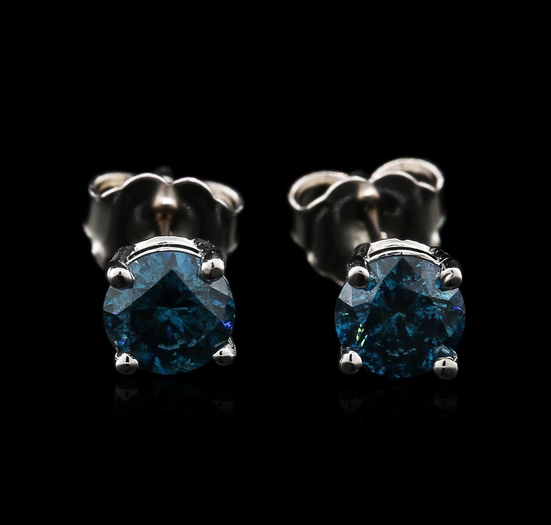 One pair electronically tested 14KT white gold ladies cast diamond stud earrings with friction posts with a bright polish finish. Identified with markings of "14K". Condition is new. Containing: Two prong set round brilliant cut diamonds, measuring 4.90 - 4.90 x 2.94mm (depth est.) approximate total weight of 2 Stones = 0.86ct. Clarity: I-3, Cut is Good. Color of the stones has been treated. Diamonds are graded in the mounting, unless otherwise stated. Total Weight of Diamonds 0.86ct. Total Weight of Stud Earrings 1.00 grams. GGL Appraised at $1,775.00.