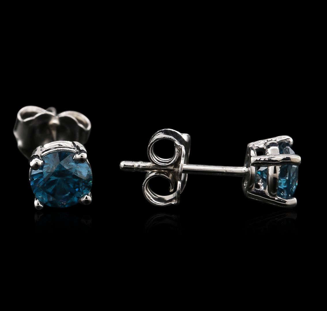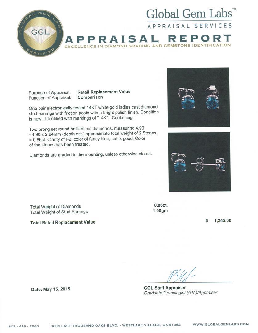 One pair electronically tested 14KT white gold ladies cast diamond stud earrings with friction posts with a bright polish finish. Identified with markings of "14K". Condition is new. Containing: Two prong set round brilliant cut diamonds, measuring 4.90 - 4.90 x 2.94mm (depth est.) approximate total weight of 2 Stones = 0.86ct. Clarity: I-2, Cut is Good. Color of the stones has been treated. Diamonds are graded in the mounting, unless otherwise stated. Total Weight of Diamonds 0.86ct. Total Weight of Stud Earrings 1.00 grams. GGL Appraised at $1,245.00.