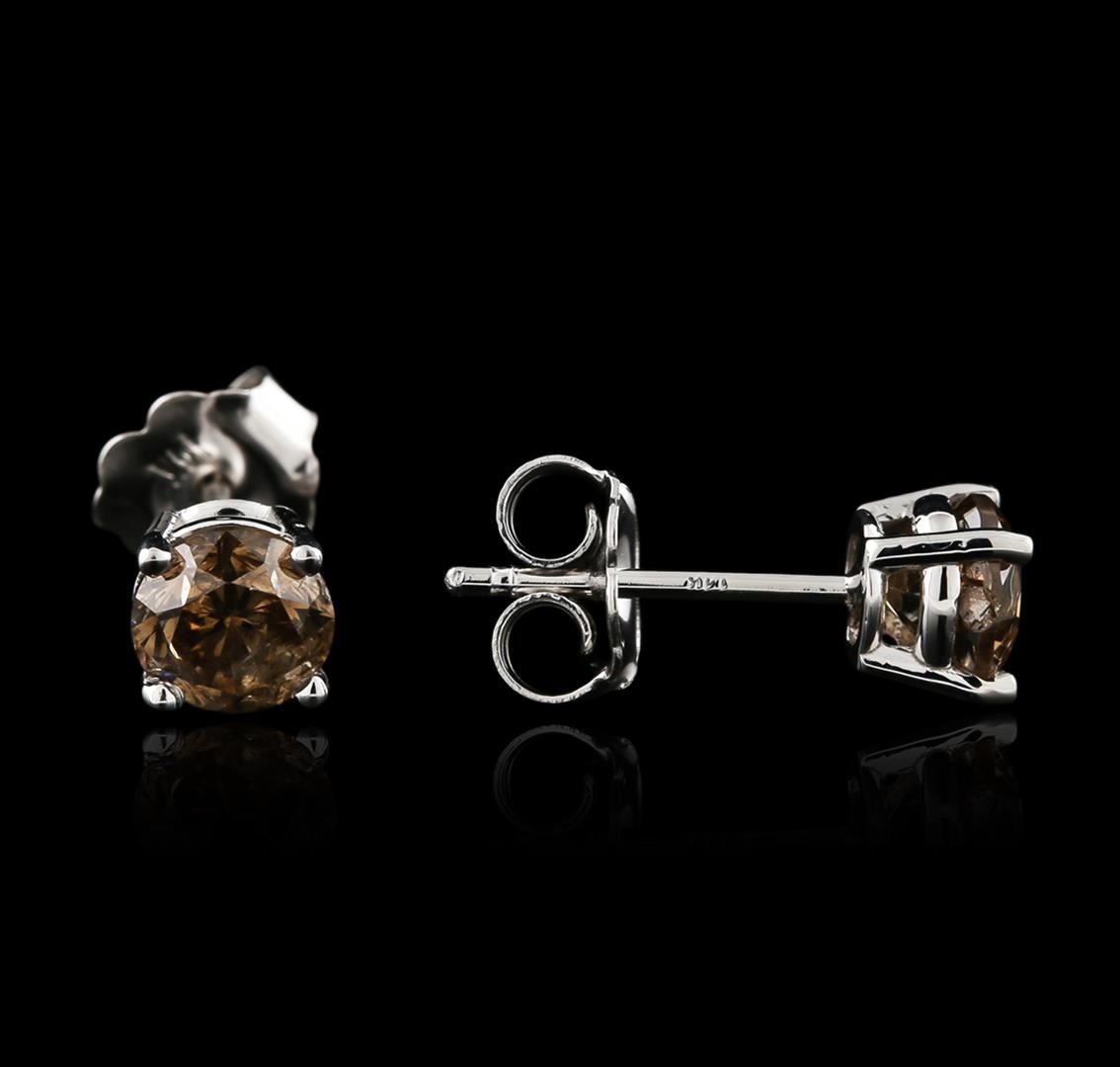 One pair electronically tested 14KT white gold ladies cast diamond stud earrings with friction posts with a bright polish finish. Identified with markings of "14K". Condition is new. Containing: Two prong set round brilliant cut diamonds, measuring 4.90 - 4.90 x 2.94mm (depth est.) approximate total weight of 2 Stones = 0.86ct. Clarity: SI-2 to I-1, Cut is Good. Diamonds are graded in the mounting, unless otherwise stated. Total Weight of Diamonds 0.86ct. Total Weight of Stud Earrings 1.00 grams. GGL Appraised at $1,725.00.