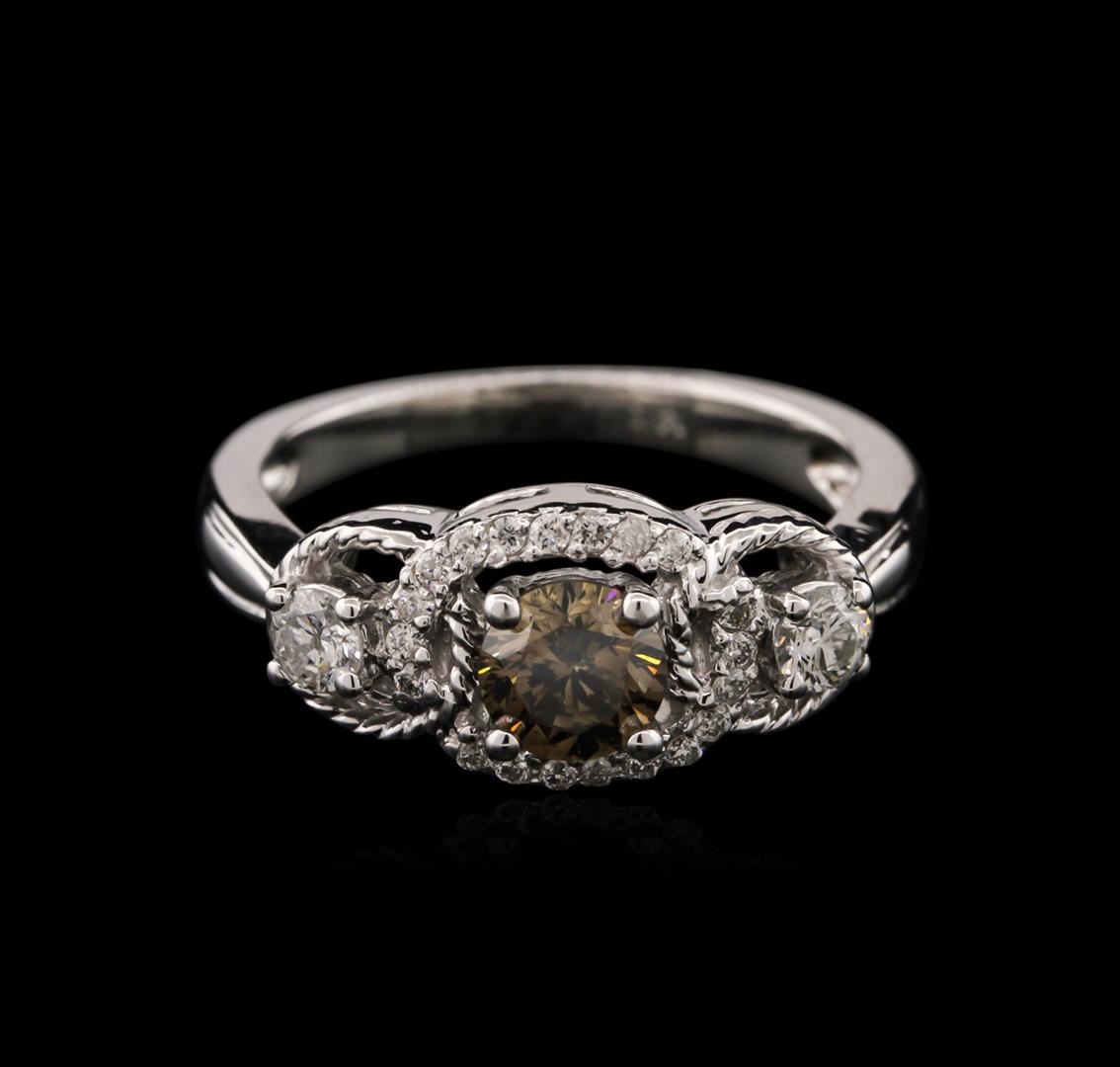 One electronically tested 14KT white gold ladies cast diamond ring with a bright polish finish. Identified with markings of "14K". Condition is new. Containing: One prong set round brilliant cut diamond, measuring 5.00 - 5.00 x 3.00mm (depth est.) approximate weight of 0.55ct. Clarity: SI-2, Cut is Good. Two prong set round brilliant cut diamonds, measuring 3.00 - 3.00 x 1.80mm (depth est.) approximate total weight of 2 Stones = 0.20 ct. Clarity: I-1. Color: H - I, Cut is Good. Twenty prong set round brilliant cut diamonds, measuring 1.10 - 1.10 x 0.66mm (depth est.) approximate total weight of 20 Stones = 0.12ct. Clarity: I-1 to I-2. Color: H - I, Cut is Good. Diamonds are graded in the mounting, unless otherwise stated. Total Weight of Diamonds 0.87ct. Total Weight of Ring 3.60 grams. GGL Appraised.