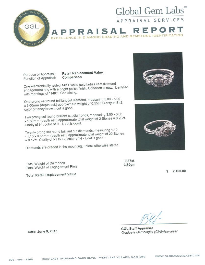 One electronically tested 14KT white gold ladies cast diamond ring with a bright polish finish. Identified with markings of "14K". Condition is new. Containing: One prong set round brilliant cut diamond, measuring 5.00 - 5.00 x 3.00mm (depth est.) approximate weight of 0.55ct. Clarity: SI-2, Cut is Good. Two prong set round brilliant cut diamonds, measuring 3.00 - 3.00 x 1.80mm (depth est.) approximate total weight of 2 Stones = 0.20 ct. Clarity: I-1. Color: H - I, Cut is Good. Twenty prong set round brilliant cut diamonds, measuring 1.10 - 1.10 x 0.66mm (depth est.) approximate total weight of 20 Stones = 0.12ct. Clarity: I-1 to I-2. Color: H - I, Cut is Good. Diamonds are graded in the mounting, unless otherwise stated. Total Weight of Diamonds 0.87ct. Total Weight of Ring 3.60 grams. GGL Appraised.