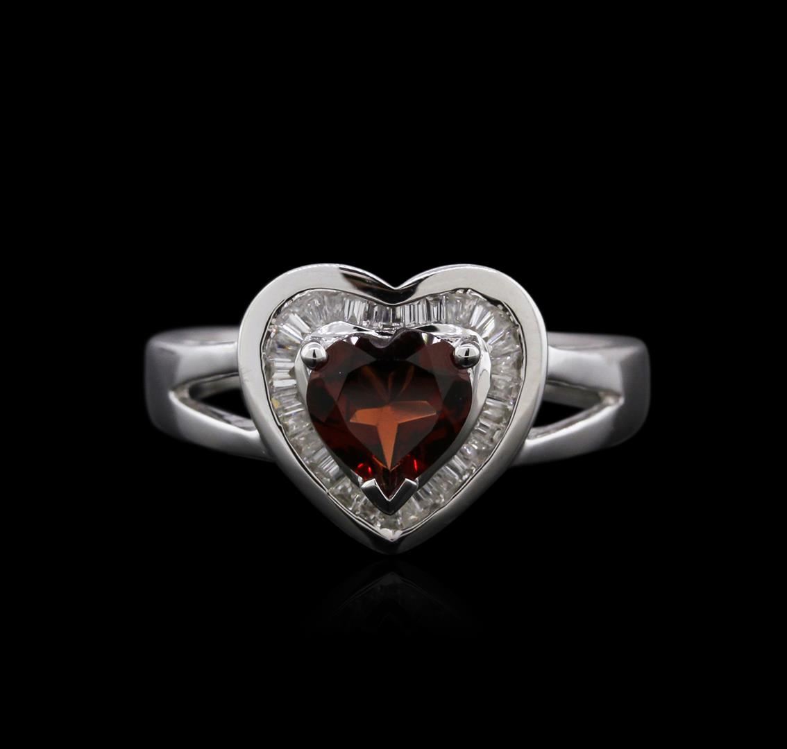 One heart shaped ring featuring: 14KT white gold weighing 3.71 grams containing one garnet center stone with a total weight of 0.87ct and diamonds with a total weight of 0.29ct.