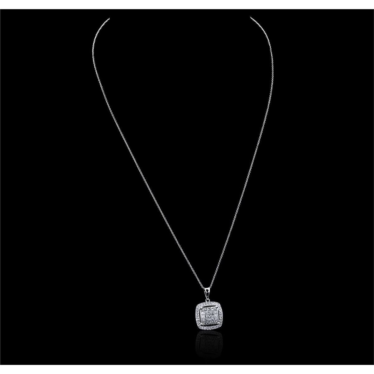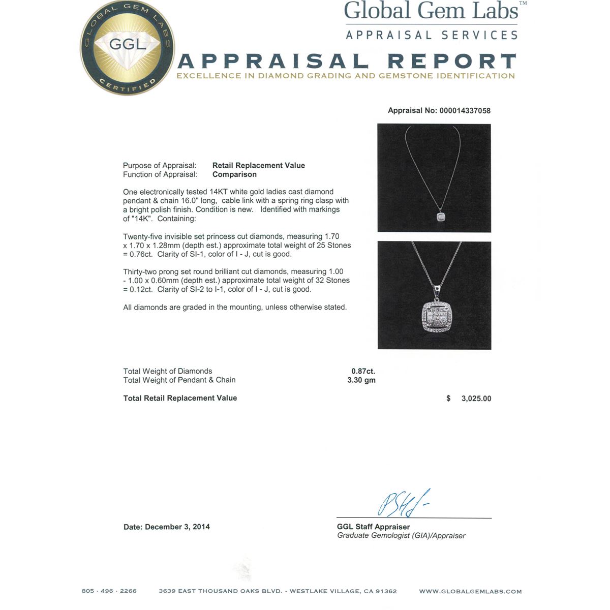 One electronically tested 14KT white gold ladies cast diamond pendant & chain 16.0" long, cable link with a spring ring clasp with a bright polish finish. Identified with markings of "14K". Condition is new. Containing: Twenty-Five invisible set princess cut diamonds, measuring 1.70 x 1.70 x 1.28mm (depth est.) approximate total weight of 25 Stones = 0.76ct. Clarity: SI-1. Color: I - J, Cut is Good. Thirty-Two prong set round brilliant cut diamonds, measuring 1.00. - 1.00. x 0.60mm (depth est.) approximate total weight of 32 Stones = 0.12ct. Clarity: SI-2 to I-1. Color: I - J, Cut is Good. All diamonds are graded in the mounting, unless otherwise stated. Total Weight of Diamonds 0.87ct. Total Weight of Pendant & Chain 3.30 grams. GGL Appraised at $3,025.00.