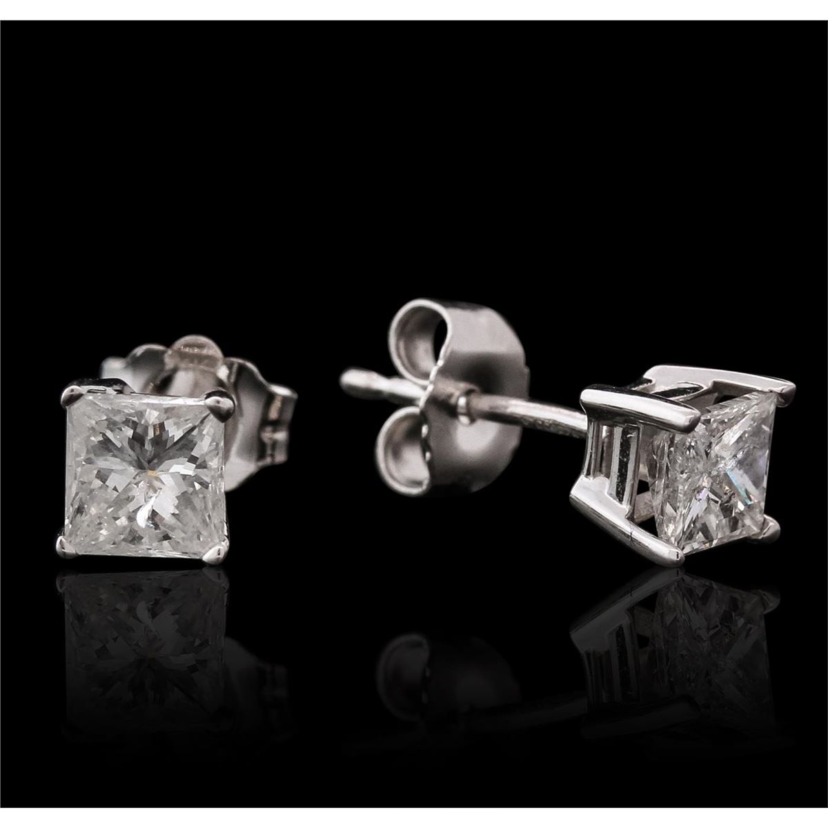 One pair electronically tested 14KT white gold cast & assembled diamond solitaire earrings with standard backs. Identified with markings of "14K". Condition is new, good workmanship. Containing: One prong set princess cut diamond, measuring 4.50 x 4.33 x 2.90mm (depth est.) approximate weight of 0.47ct. Graded in the setting. Clarity: I-1. Color: I. Depth 67.0%. Table 83.1%. One prong set princess cut diamond, measuring 4.10 x 4.10 x 2.80mm (depth est.), 3.00% GTCF approximate weight of 0.40ct. Graded in the setting. Clarity: I-2. Color: H. Depth 68.3%. Table 84.2%. Total Weight of Diamonds 0.87ct. Total Weight of Earrings 0.81 grams. AIG Appraised at $2,480.00.
