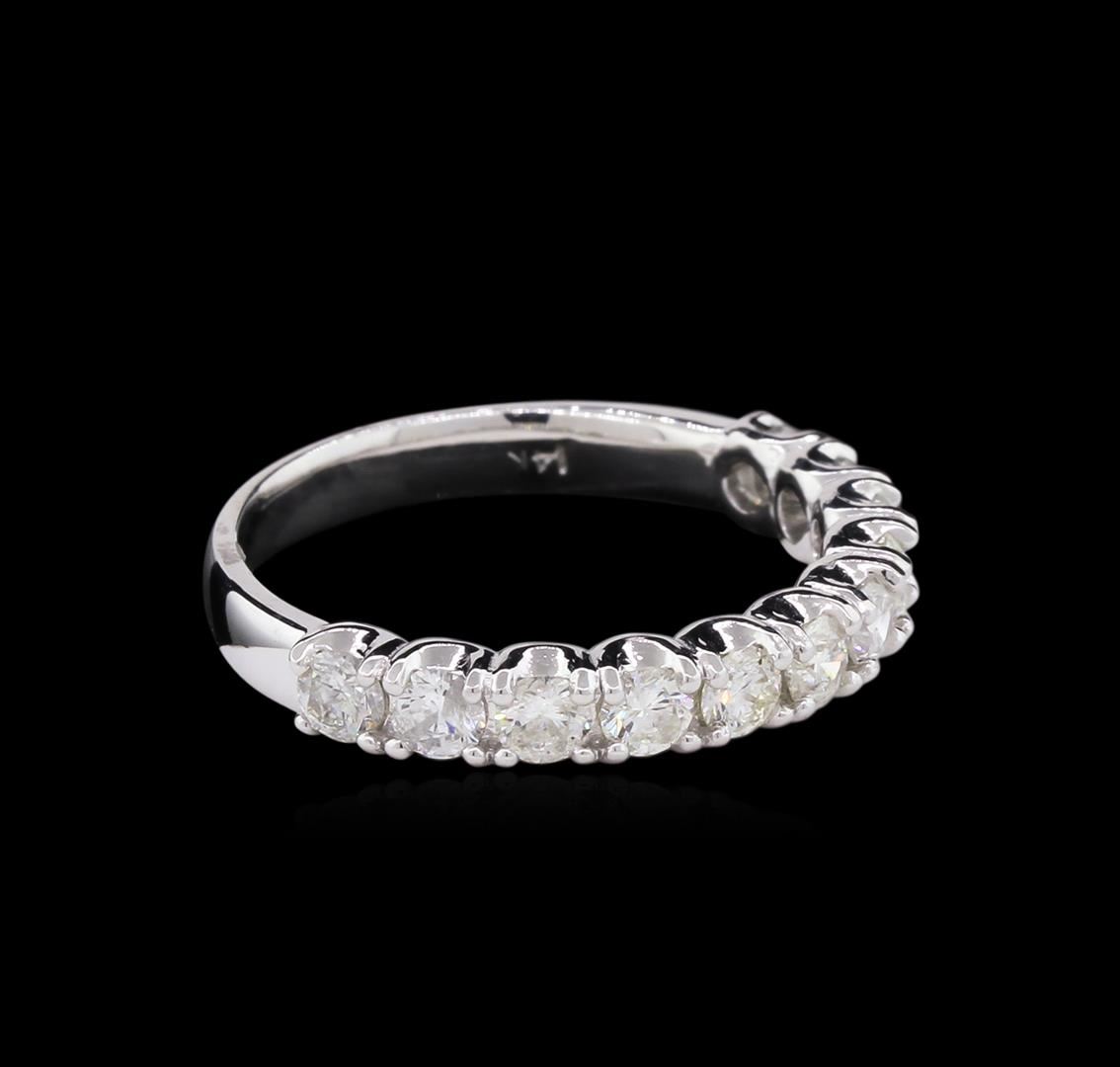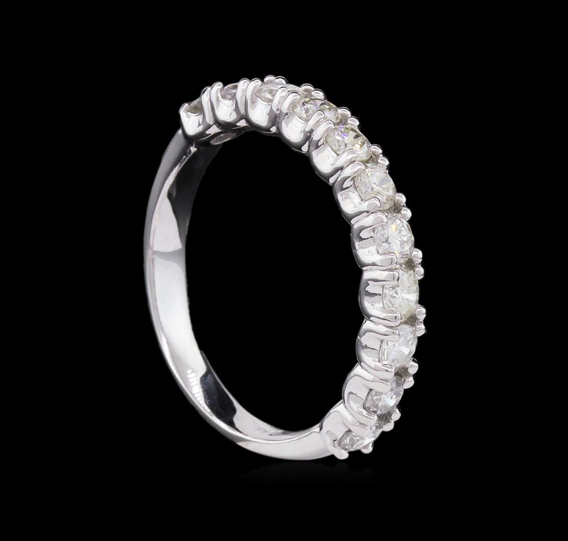 One electronically tested 14KT white gold ladies cast diamond wedding band with a bright polish finish. Identified with markings of "14K". Condition is new. Containing: Eleven prong set round brilliant cut diamonds, measuring 2.80 - 2.80 x 1.68mm (depth est.) approximate total weight of 11 Stones = 0.88ct. Clarity: SI-1 to I-1. Color: I - J, Cut is Good. All diamonds are graded in the mounting, unless otherwise stated. Total Weight of Diamonds 0.88ct. Total Weight of Wedding Band 3.20 grams. GGL Appraised at $2,775.00.