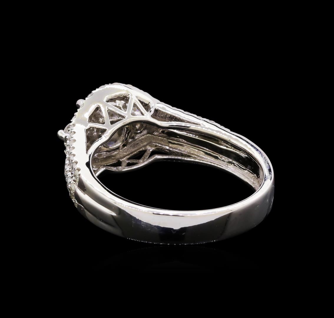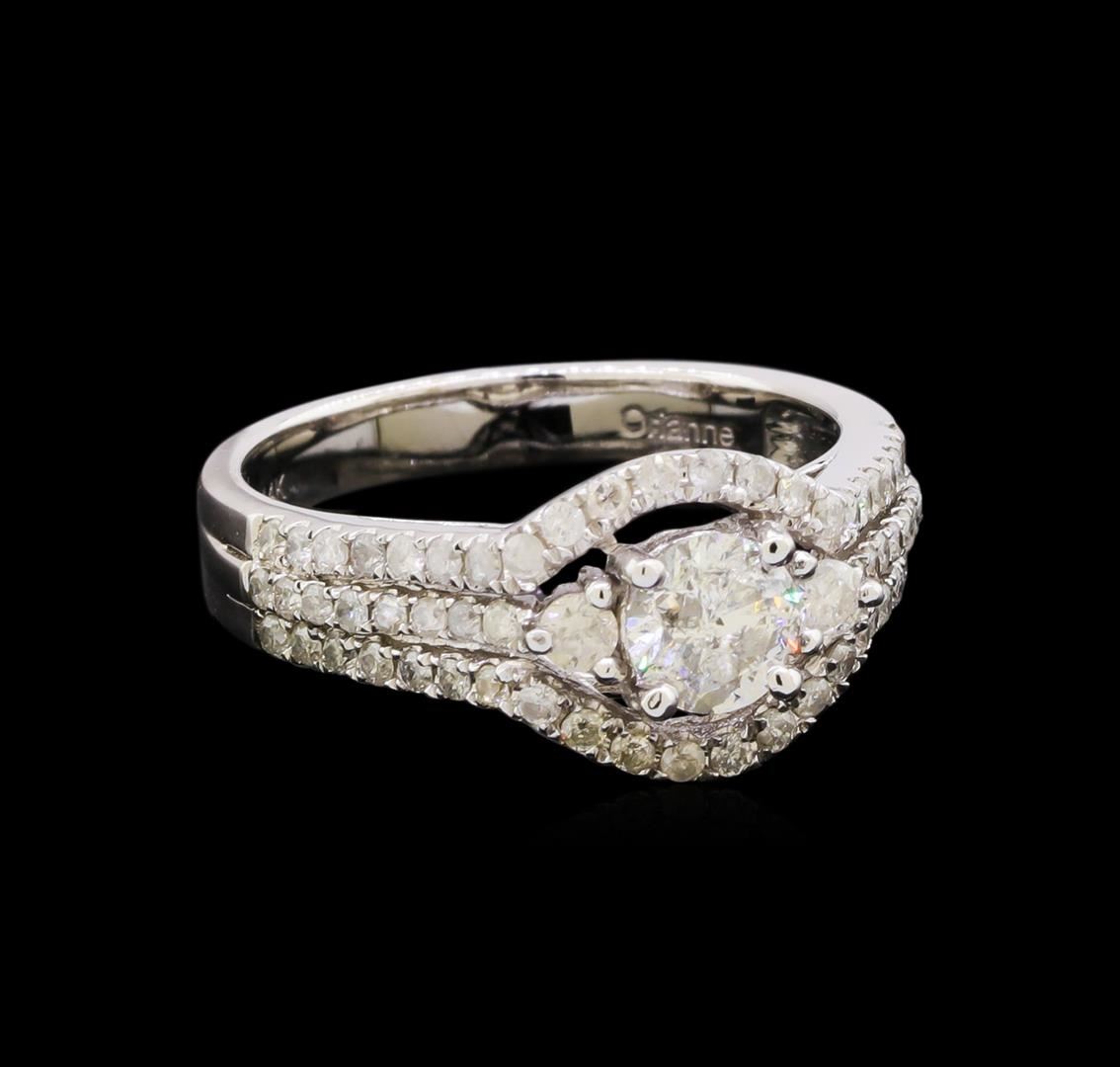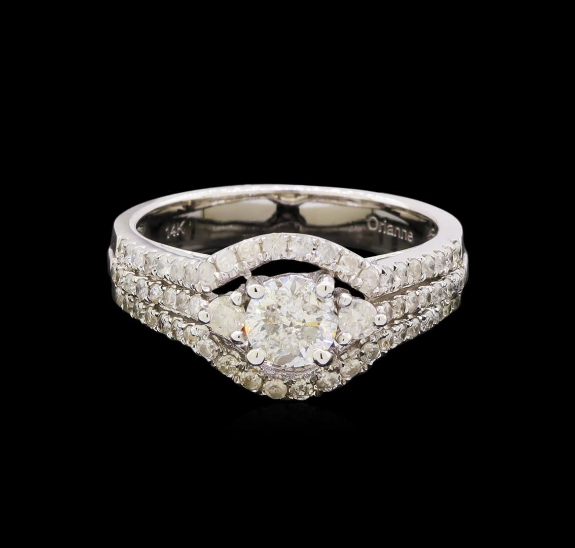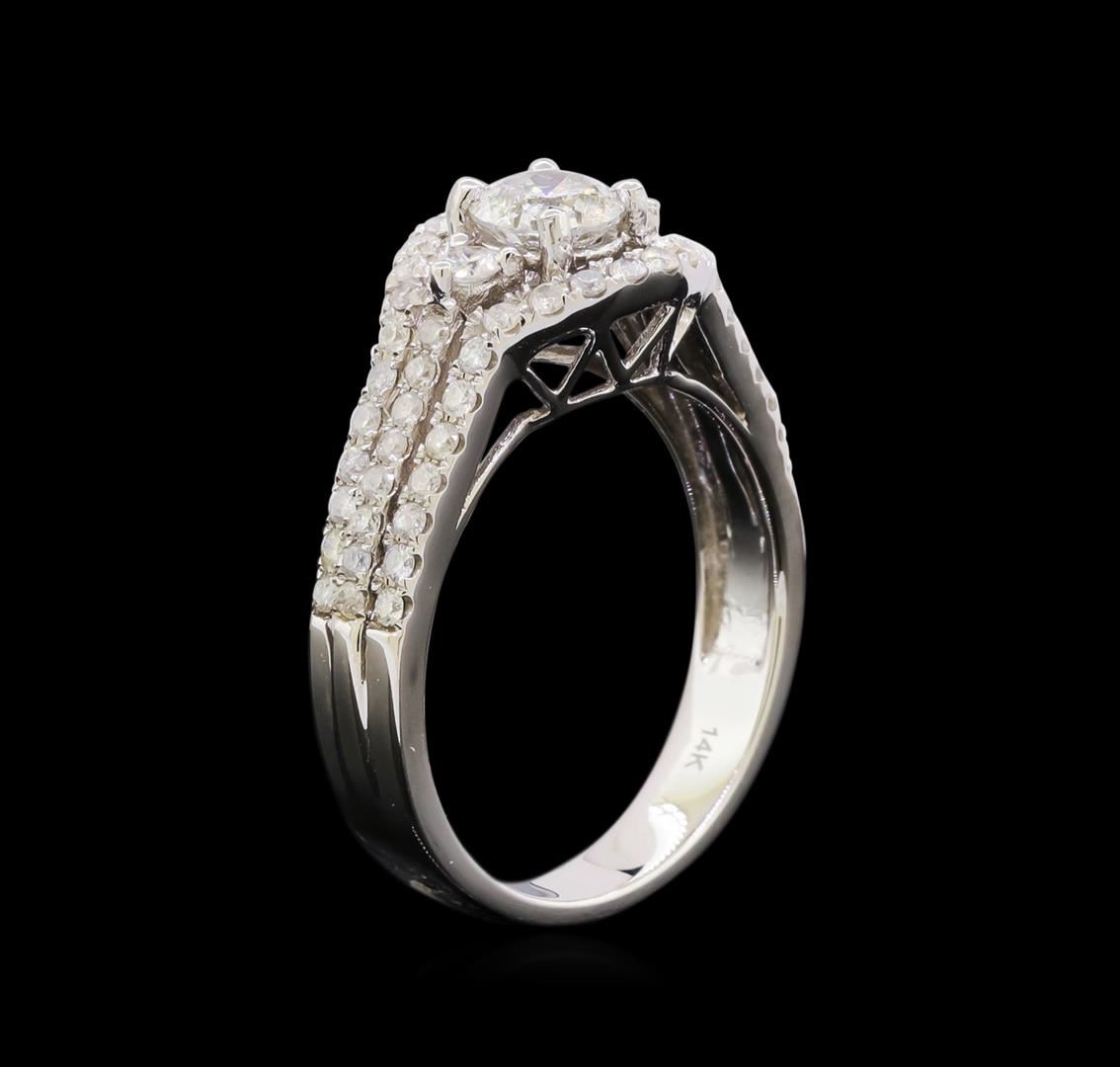 One electronically tested 14KT white gold ladies combination cast & assembled engagement ring with a flat shank with a bright polish finish. Identified with markings of "14K". Condition is new. Containing: One prong set round brilliant cut diamond, measuring 5.10 - 5.10 x 3.06mm (depth est.) approximate weight of 0.49ct. Clarity: I-2. Color: I, Cut is Good. Sixty-Two prong set round brilliant cut diamonds, measuring 1.20 - 1.20 x 0.72mm (depth est.) approximate total weight of 62 Stones = 0.39ct. Clarity: I-1 to I-3. Color: I - J, Cut is Good. All diamonds are graded in the mounting, unless otherwise stated. Total Weight of Diamonds 0.88ct. Total Weight of Ring 4.80 grams. GGL Appraised at $4,300.00.