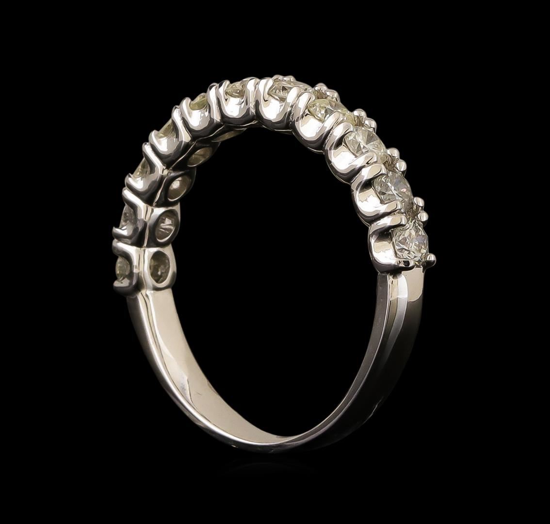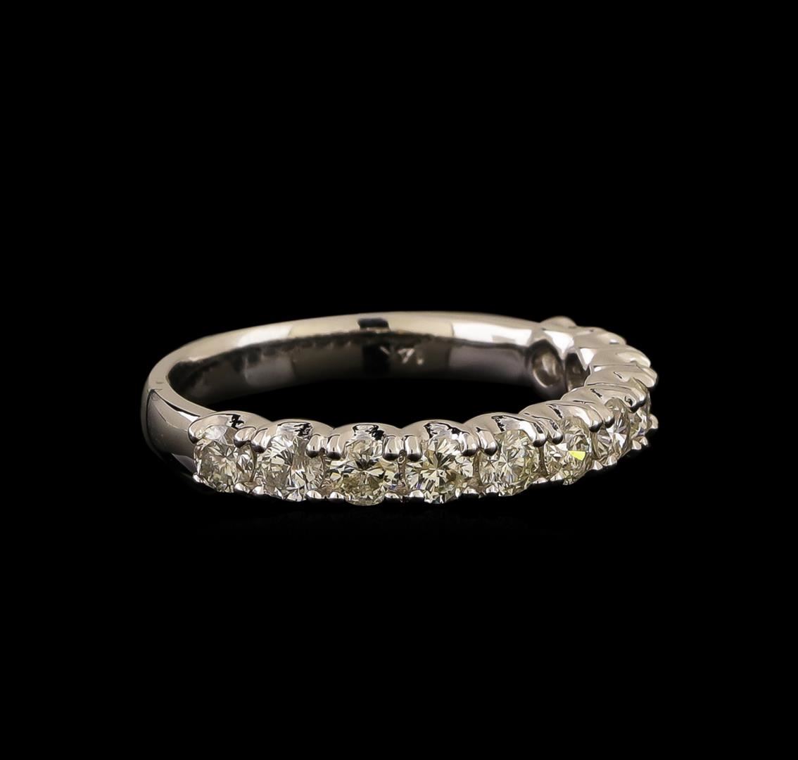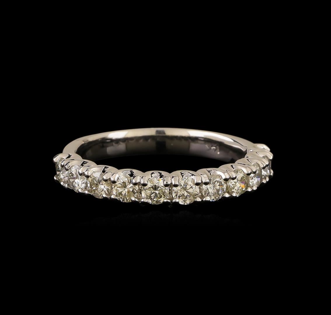 One electronically tested 14KT white gold ladies cast diamond wedding band with a bright polish finish. Identified with markings of "14K". Condition is new. Containing: Eleven prong set round brilliant cut diamonds, measuring 2.80 - 2.80 x 1.68mm (depth est.) approximate total weight of 11 Stones = 0.88ct. Clarity: SI-1 to I-1. Color: I - J, Cut is Good. All diamonds are graded in the mounting, unless otherwise stated. Total Weight of Diamonds 0.88ct. Total Weight of Wedding Band 3.20 grams. GGL Appraised at $2,775.00.