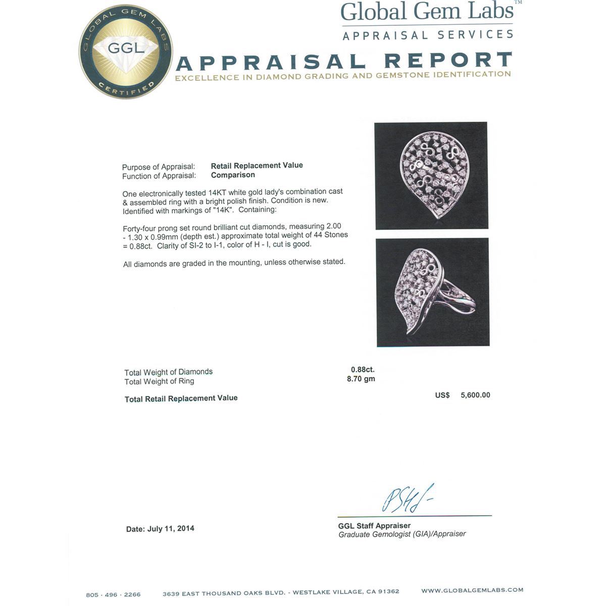 One electronically tested 14KT white gold Ladies combination cast & assembled ring with a bright polish finish. Condition is new. Identified with markings of "14K". Containing: Forty-Four prong set round brilliant cut diamonds, measuring 2.00 - 1.30 x 0.99mm (depth est.) approximate. Total Weight of 44 Stones = 0.88ct. Clarity: SI-2 to I-1. Color: H - I, Cut is Good. All diamonds are graded in the mounting, unless otherwise stated. Total Weight of Diamonds 0.88ct. Total Weight of Ring 8.70 grams. GGL Appraised at $5,600.00.