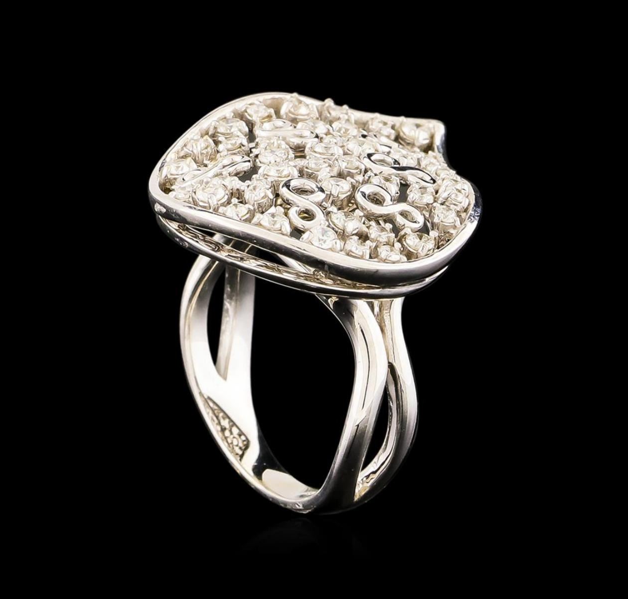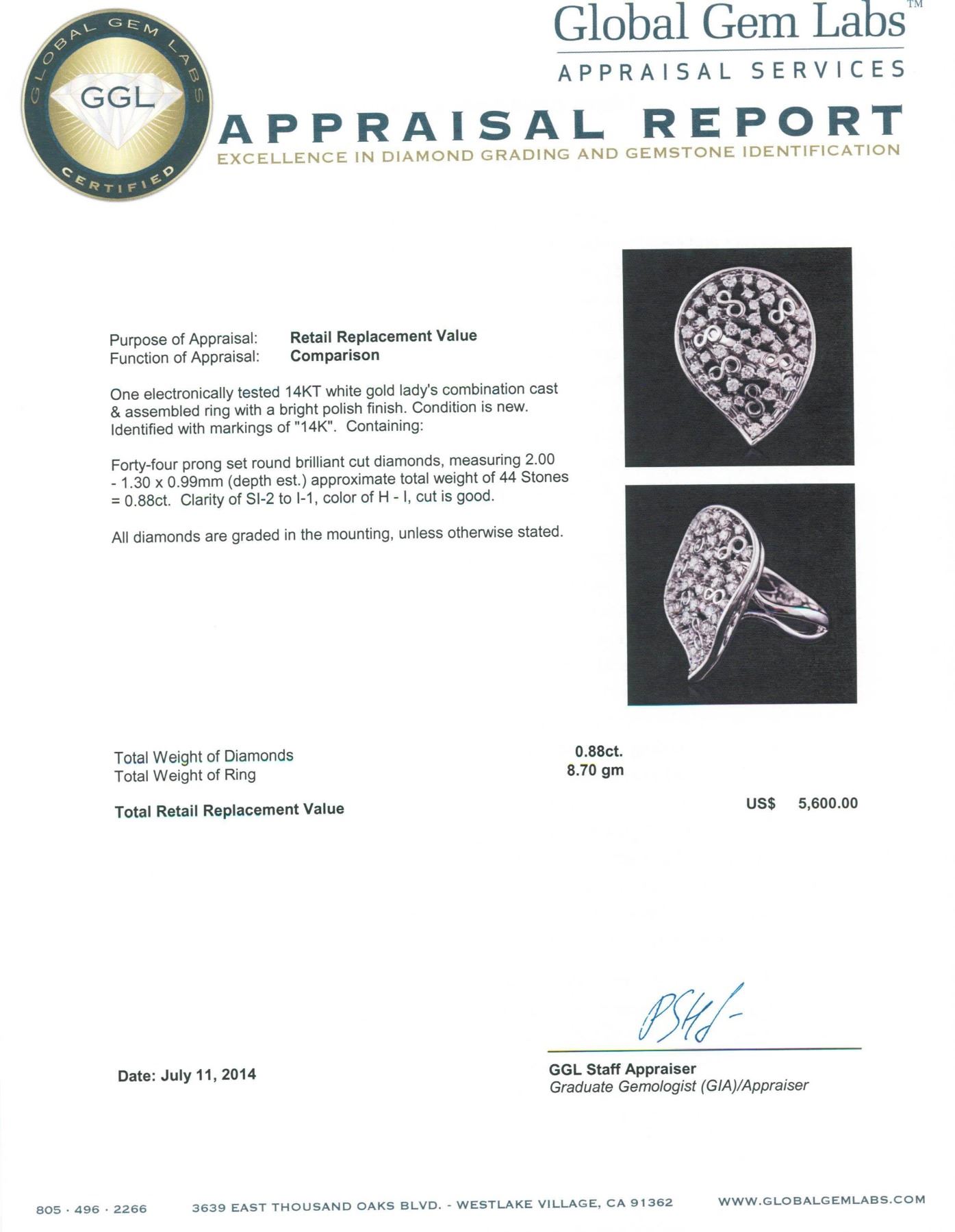 One electronically tested 14KT white gold Ladies combination cast & assembled ring with a bright polish finish. Condition is new. Identified with markings of "14K". Containing: Forty-Four prong set round brilliant cut diamonds, measuring 2.00 - 1.30 x 0.99mm (depth est.) approximate. Total Weight of 44 Stones = 0.88ct. Clarity: SI-2 to I-1. Color: H - I, Cut is Good. All diamonds are graded in the mounting, unless otherwise stated. Total Weight of Diamonds 0.88ct. Total Weight of Ring 8.70 grams. GGL Appraised.