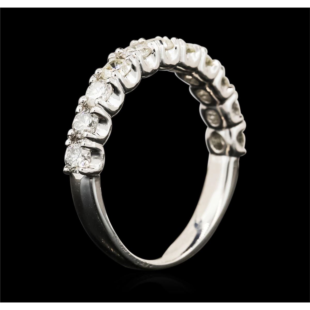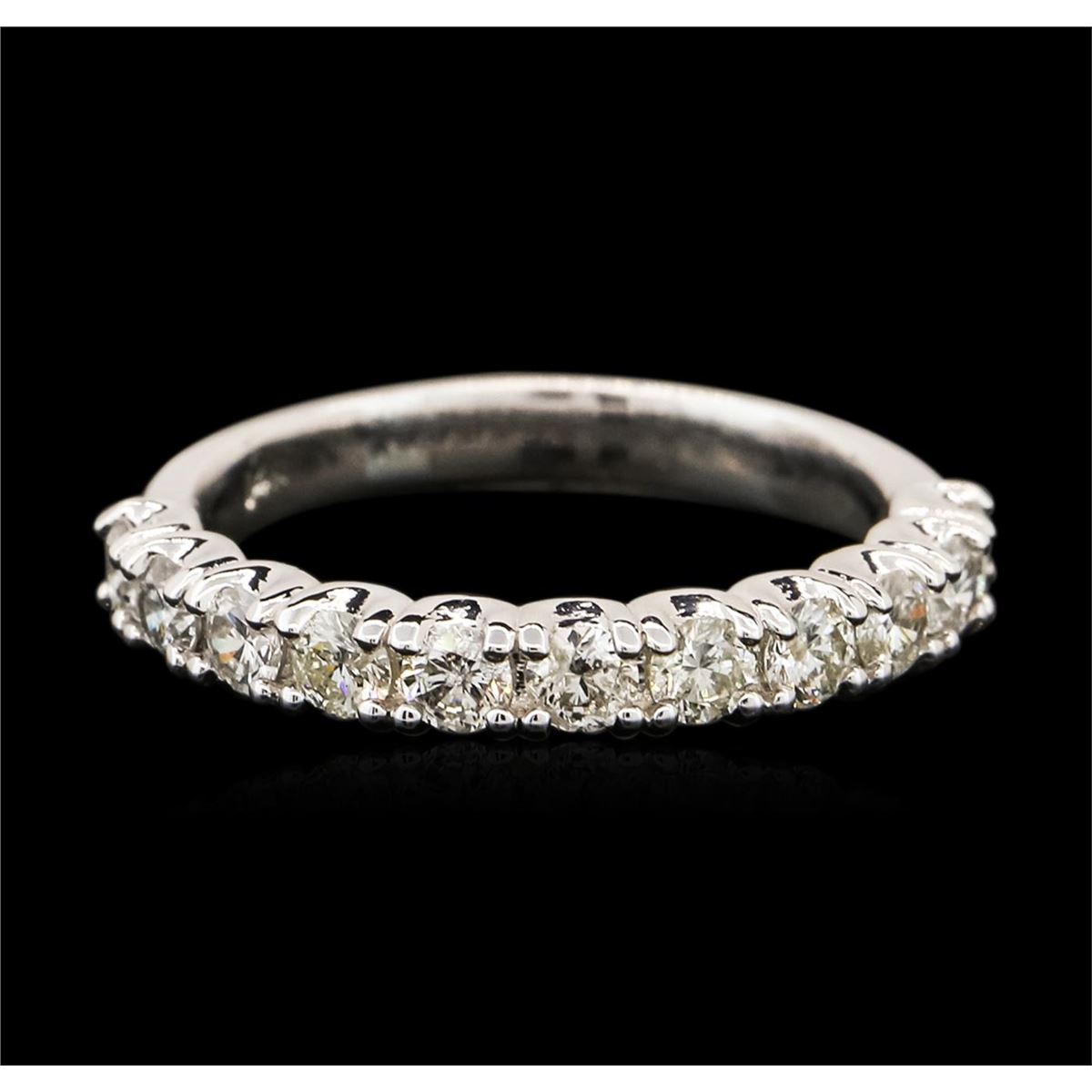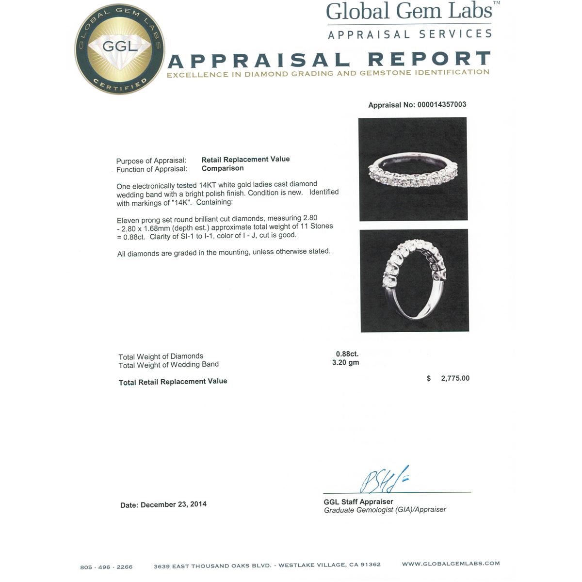 One electronically tested 14KT white gold ladies cast diamond wedding band with a bright polish finish. Identified with markings of "14K". Condition is new. Containing: Eleven prong set round brilliant cut diamonds, measuring 2.80 - 2.80 x 1.68mm (depth est.) approximate total weight of 11 Stones = 0.88ct. Clarity: SI-1 to I-1. Color: I - J, Cut is Good. All diamonds are graded in the mounting, unless otherwise stated. Total Weight of Diamonds 0.88ct. Total Weight of Wedding Band 3.20 grams. GGL Appraised at $2,775.00.
