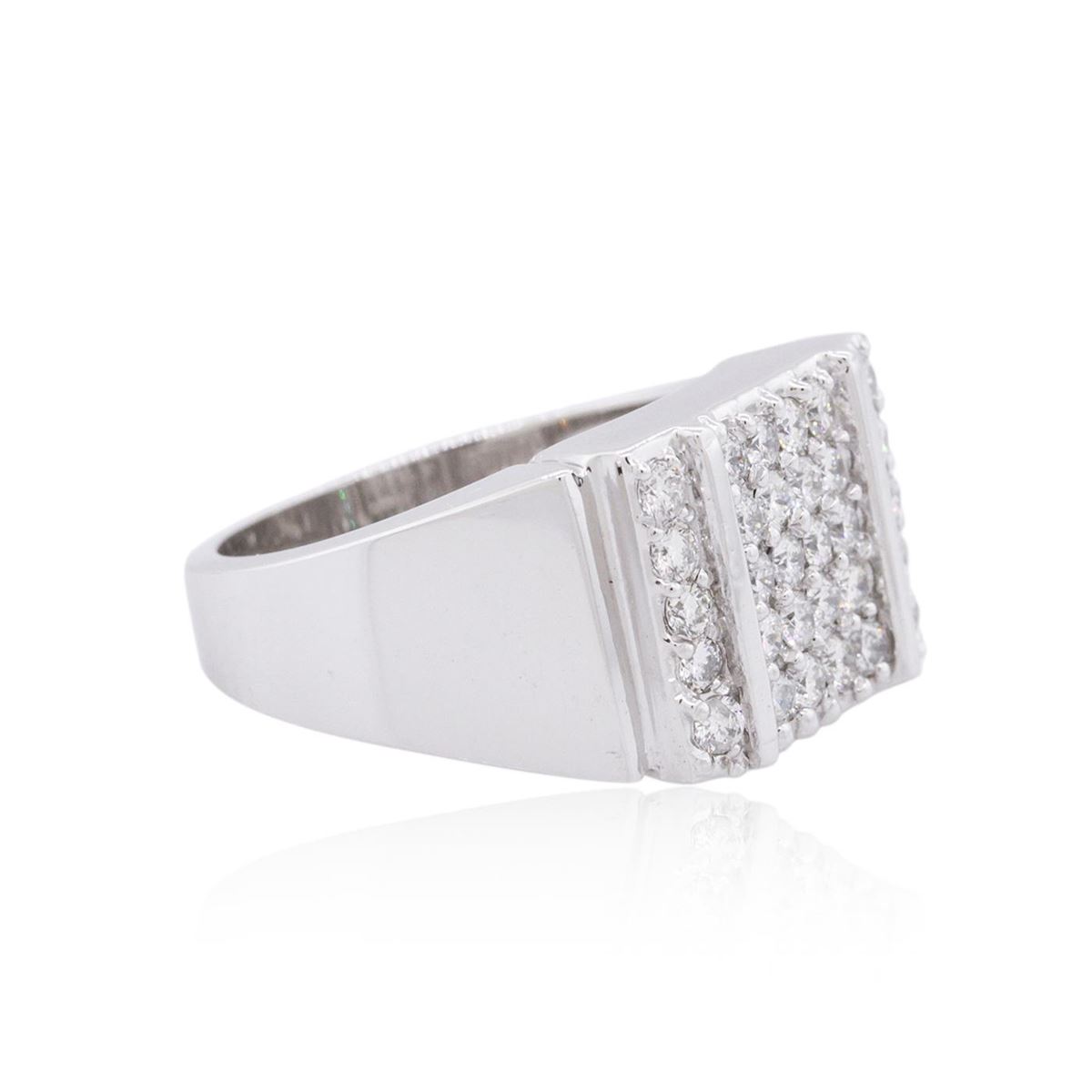 One electronically tested 14KT white gold mens cast diamond ring with a tapered shank with a bright polish finish. Identified with markings of "14K". Condition is new. Containing: Thirty prong set round brilliant cut diamonds, measuring 2.00 - 2.00 x 1.20mm (depth est.) approximate total weight of 30 Stones = 0.88ct. Clarity: SI-1 to SI-2. Color: H - I, Cut is Good. All diamonds are graded in the mounting, unless otherwise stated. Total Weight of Diamonds 0.88ct. Total Weight of Ring 14.40 grams. GGL Appraised at $5,320.00.