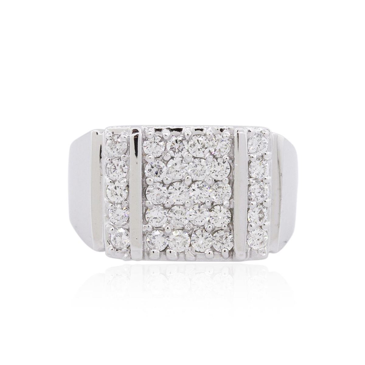 One electronically tested 14KT white gold mens cast diamond ring with a tapered shank with a bright polish finish. Identified with markings of "14K". Condition is new. Containing: Thirty prong set round brilliant cut diamonds, measuring 2.00 - 2.00 x 1.20mm (depth est.) approximate total weight of 30 Stones = 0.88ct. Clarity: SI-1 to SI-2. Color: H - I, Cut is Good. All diamonds are graded in the mounting, unless otherwise stated. Total Weight of Diamonds 0.88ct. Total Weight of Ring 14.40 grams. GGL Appraised at $5,320.00.