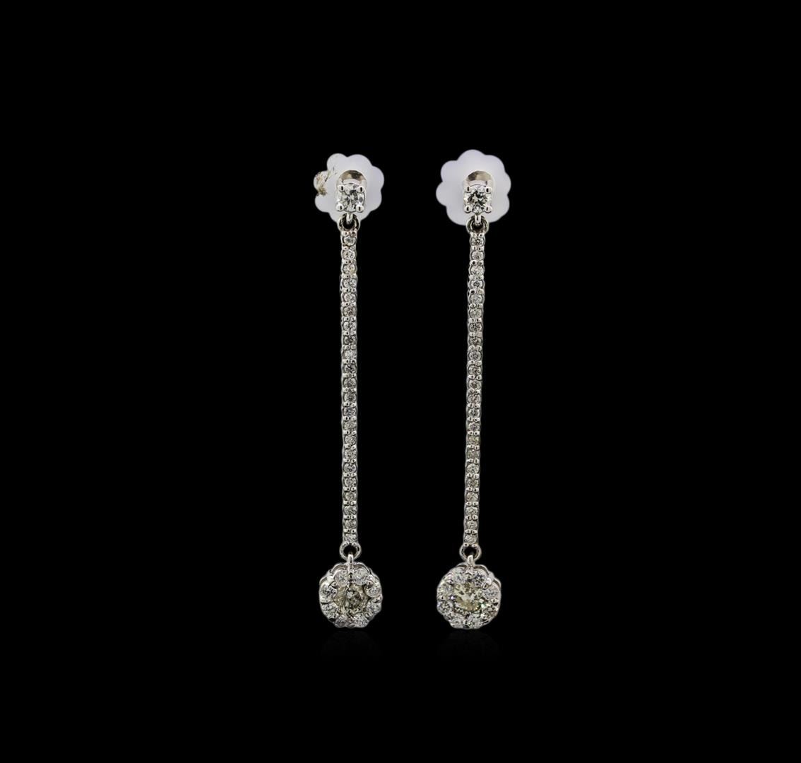 One pair electronically tested 14KT white gold ladies cast diamond earrings with friction posts with a bright polish finish. Identified with markings of "585". Condition is new. Containing: Two prong set round brilliant cut diamonds, measuring 3.50 - 3.50 x 2.10mm (depth est.) approximate total weight of 2 Stones = 0.30 ct. Clarity: I-1. Color: J, Cut is Good. Sixty-Two prong set round brilliant cut diamonds, measuring 2.00 - 1.20 x 0.96mm (depth est.) approximate total weight of 62 Stones = 0.59ct. Clarity: I-1 to I-2. Color: I - J, Cut is Good. Diamonds are graded in the mounting, unless otherwise stated. Total Weight of Diamonds 0.89ct. Total Weight of Earrings 4.10 grams. GGL Appraised.