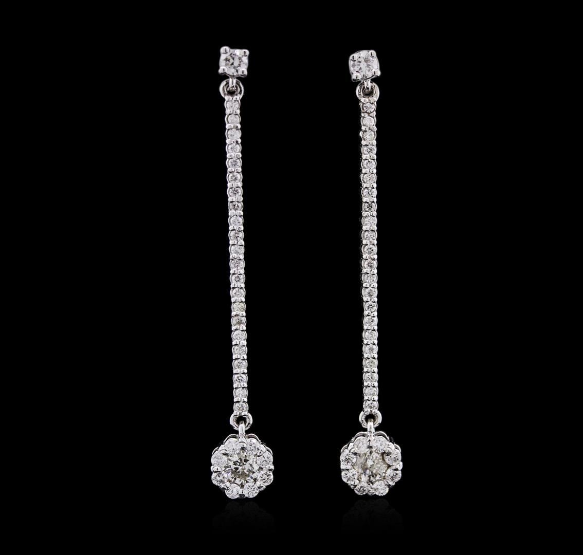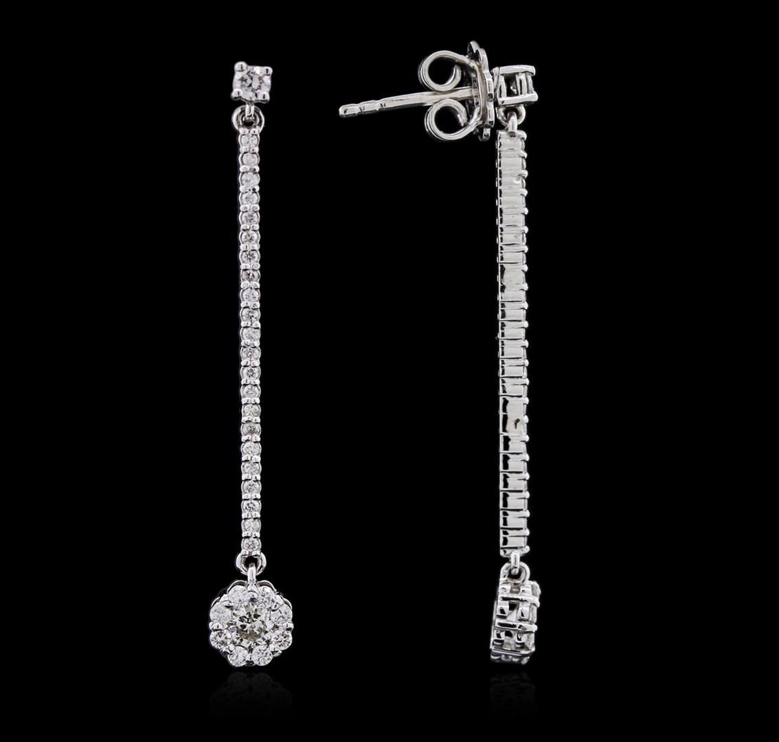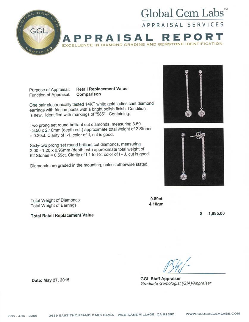 One pair electronically tested 14KT white gold ladies cast diamond earrings with friction posts with a bright polish finish. Identified with markings of "585". Condition is new. Containing: Two prong set round brilliant cut diamonds, measuring 3.50 - 3.50 x 2.10mm (depth est.) approximate total weight of 2 Stones = 0.30ct. Clarity: I-1. Color: J, Cut is Good. Sixty-Two prong set round brilliant cut diamonds, measuring 2.00 - 1.20 x 0.96mm (depth est.) approximate total weight of 62 Stones = 0.59ct. Clarity: I-1 to I-2. Color: I - J, Cut is Good. Diamonds are graded in the mounting, unless otherwise stated. Total Weight of Diamonds 0.89ct. Total Weight of Earrings 4.10 grams. GGL Appraised at $1,985.00.