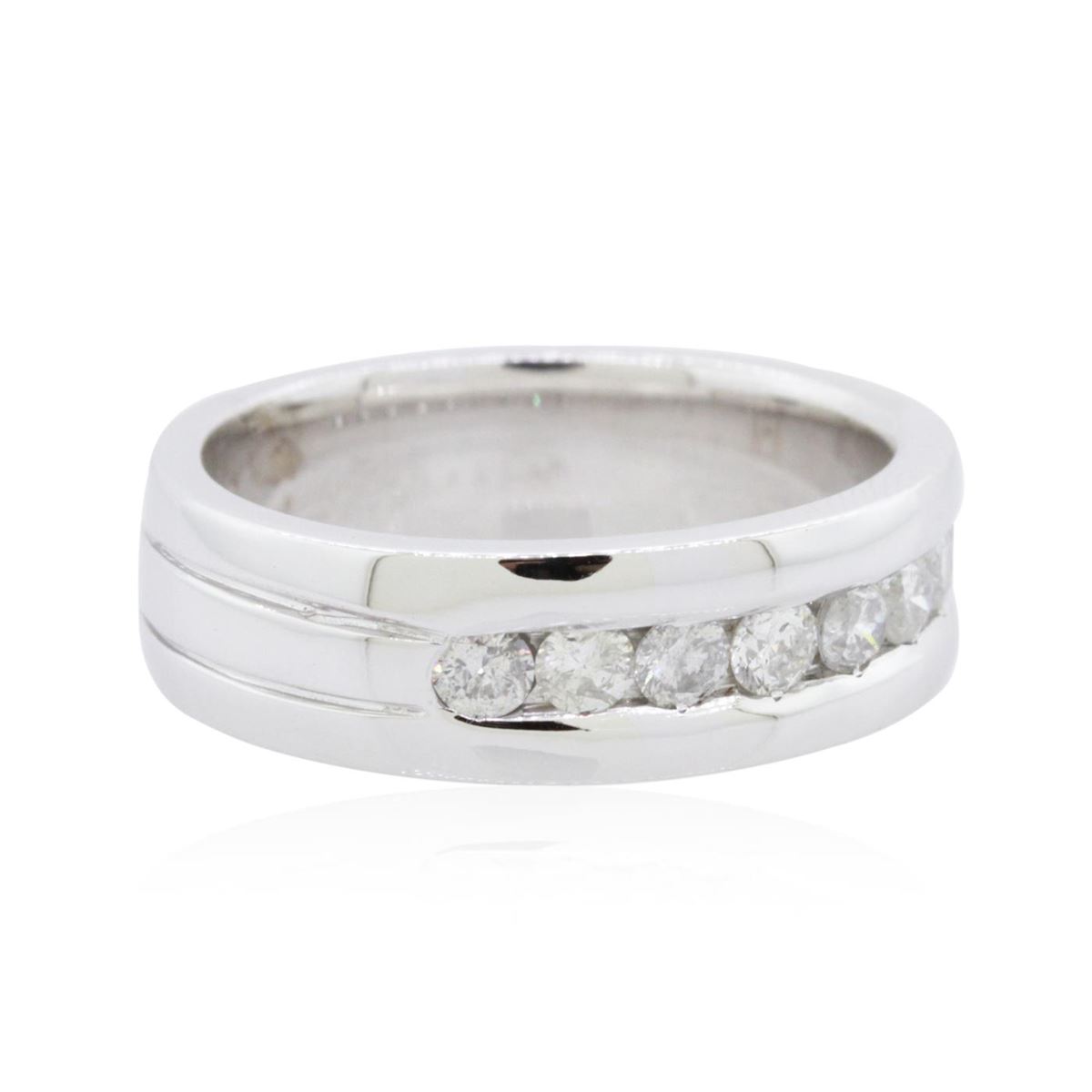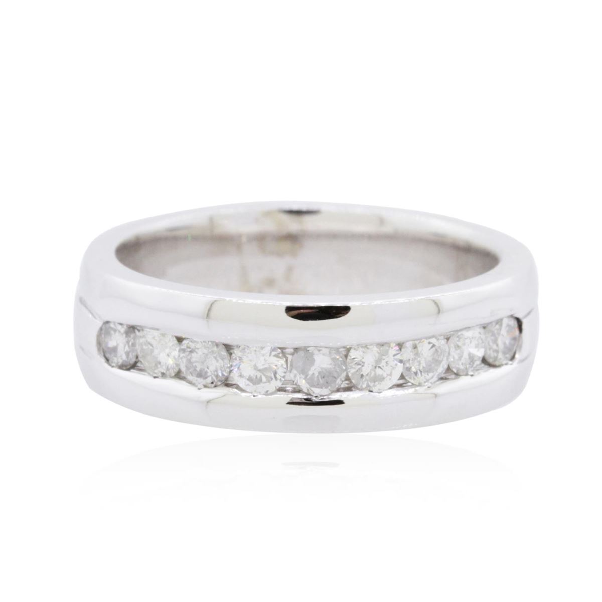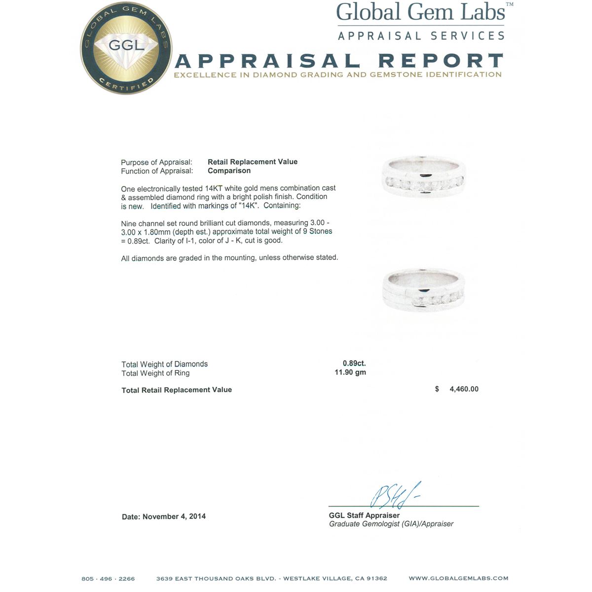 One electronically tested 14KT white gold mens combination cast & assembled diamond ring with a bright polish finish. Identified with markings of "14K". Condition is new. Containing: Nine channel set round brilliant cut diamonds, measuring 3.00 - 3.00 x 1.80mm (depth est.) approximate total weight of 9 Stones = 0.89ct. Clarity: I-1. Color: J - K, Cut is Good. All diamonds are graded in the mounting, unless otherwise stated. Total Weight of Diamonds 0.89ct. Total Weight of Ring 11.90 grams. GGL Appraised at $4,460.00.