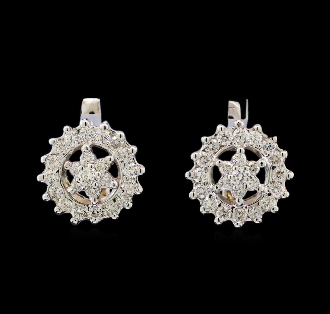 One pair electronically tested 14KT white gold ladies cast diamond earrings with hinged clip backs with a bright polish finish. Identified with markings of "14K". Condition is new. Containing: Forty-Eight prong set round brilliant cut diamonds, measuring 2.50 - 1.90 x 1.32mm (depth est.) approximate total weight of 48 Stones = 0.90ct. Clarity: SI-1 to SI-2. Color: I - J, Cut is Good. All diamonds are graded in the mounting, unless otherwise stated. Total Weight of Diamonds 0.90ct. Total Weight of Earrings 6.90 grams. GGL Appraised at $4,120.00.