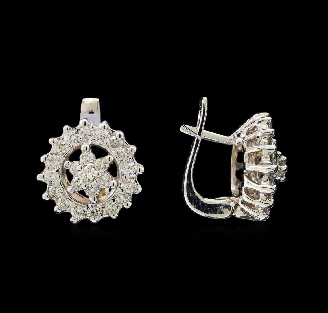 One pair electronically tested 14KT white gold ladies cast diamond earrings with hinged clip backs with a bright polish finish. Identified with markings of "14K". Condition is new. Containing: Forty-Eight prong set round brilliant cut diamonds, measuring 2.50 - 1.90 x 1.32mm (depth est.) approximate total weight of 48 Stones = 0.90ct. Clarity: SI-1 to SI-2. Color: I - J, Cut is Good. All diamonds are graded in the mounting, unless otherwise stated. Total Weight of Diamonds 0.90ct. Total Weight of Earrings 6.90 grams. GGL Appraised at $4,120.00.