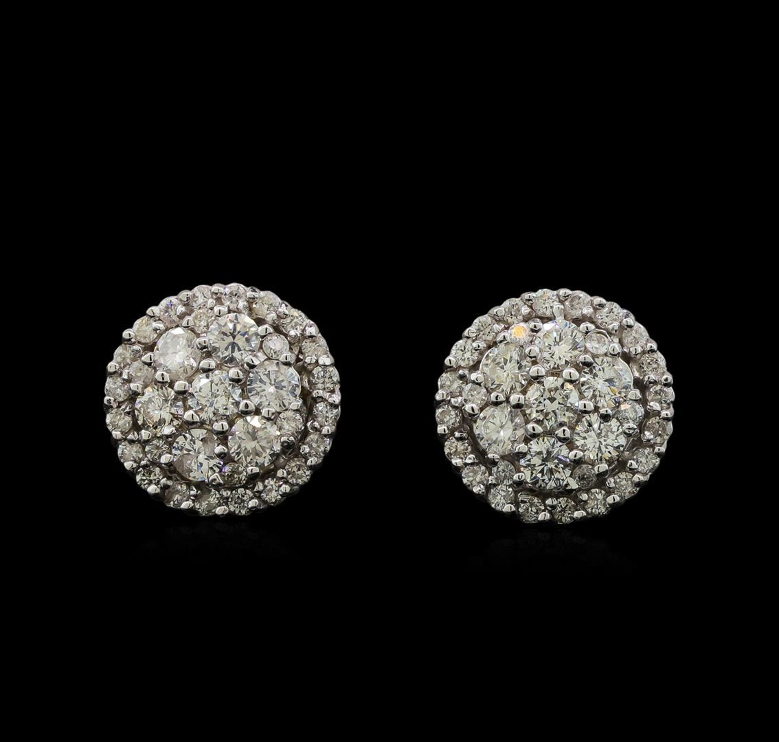 One pair electronically tested 14KT white gold ladies cast diamond earrings with friction posts with a bright polish finish. Identified with markings of "585". Condition is new. Containing: Fifty-two prong set round brilliant cut diamonds, measuring 1.10 - 1.10 x 0.66mm (depth est.) approximate total weight of 52 Stones = 0.30ct. Clarity: SI-2 to I-2. Color: G - H, Cut is Good. Fourteen prong set round brilliant cut diamonds, measuring 2.00 - 2.00 x 1.20mm (depth est.) approximate total weight of 14 Stones = 0.60ct. Clarity of SI-1 to S1-2, color of H - I, cut is good. All diamonds are graded in the mounting, unless otherwise stated. Total Weight of Diamonds 0.90ct. Total Weight of Earrings 3.30 grams. GGL Appraised at $2,340.00.