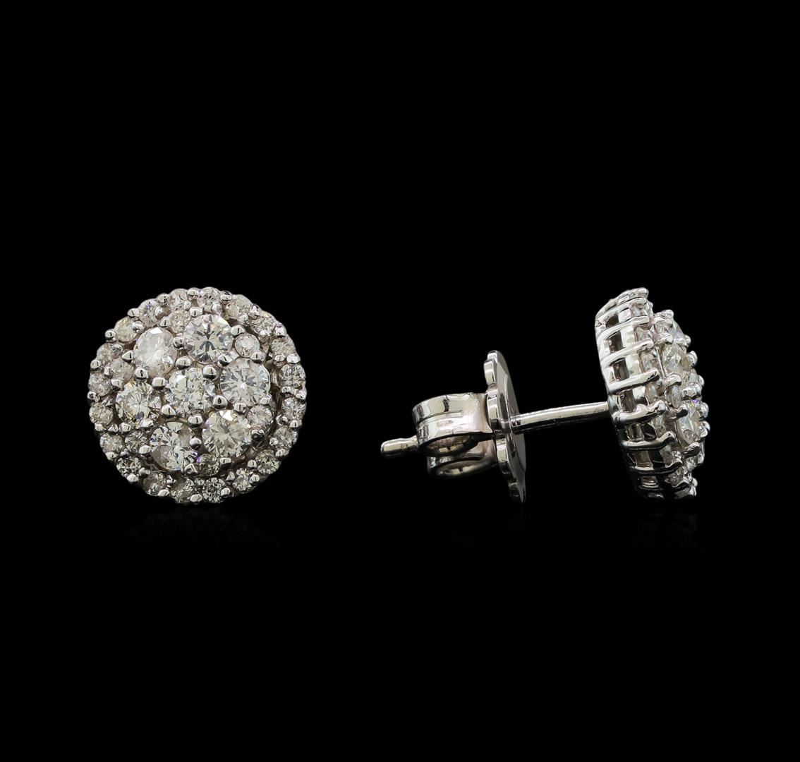 One pair electronically tested 14KT white gold ladies cast diamond earrings with friction posts with a bright polish finish. Identified with markings of "585". Condition is new. Containing: Fifty-two prong set round brilliant cut diamonds, measuring 1.10 - 1.10 x 0.66mm (depth est.) approximate total weight of 52 Stones = 0.30ct. Clarity: SI-2 to I-2. Color: G - H, Cut is Good. Fourteen prong set round brilliant cut diamonds, measuring 2.00 - 2.00 x 1.20mm (depth est.) approximate total weight of 14 Stones = 0.60ct. Clarity of SI-1 to S1-2, color of H - I, cut is good. All diamonds are graded in the mounting, unless otherwise stated. Total Weight of Diamonds 0.90ct. Total Weight of Earrings 3.30 grams. GGL Appraised at $2,340.00.