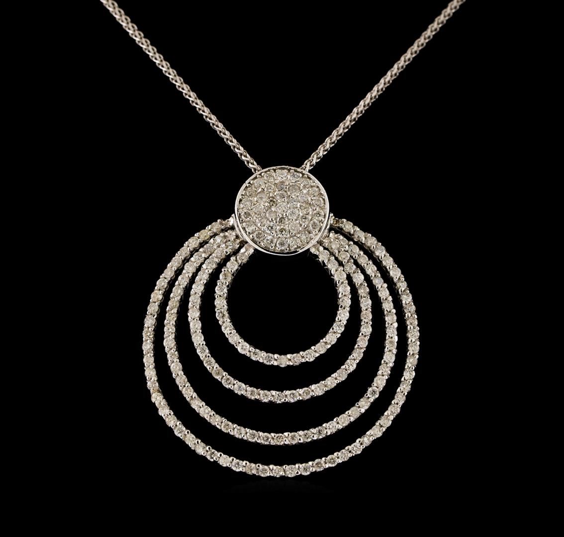 One electronically tested 14KT white gold ladies cast & assembled diamond pendant with chain. The pendant features four diamond set draping ribbons, completed by a diamond set bail. The pendant is supported by an eighteen inch length 14KT white gold designer style chain, terminating in a lobster claw clasp. Bright polish finish. Identified with markings of "K14". Condition is new, good workmanship. Containing: One Hundred Eighty-Nine prong set round brilliant cut diamonds, measuring 1.10 - 1.00 x 0.63mm (depth est.) approximate total weight of 189 Stones = 0.90 ct. Graded in the setting. Clarity: I-1 to I-2. Color: G - J. Total Weight of Diamonds 0.90 ct. Total Weight of Pendant With Chain 7.44 grams. AIG Appraised.