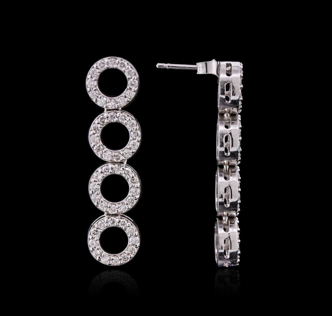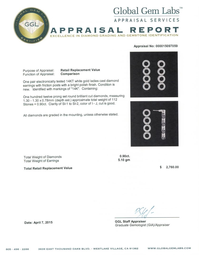 One pair electronically tested 14KT white gold ladies cast diamond earrings with friction posts with a bright polish finish. Identified with markings of "14K". Condition is new. Containing: One Hundred Twelve prong set round brilliant cut diamonds, measuring 1.30 - 1.30 x 0.78mm (depth est.) approximate total weight of 112 Stones = 0.90ct. Clarity: SI-1 to SI-2. Color: I - J, Cut is Good. All diamonds are graded in the mounting, unless otherwise stated. Total Weight of Diamonds 0.90ct. Total Weight of Earrings 5.10 grams. GGL Appraised at $2,760.00.