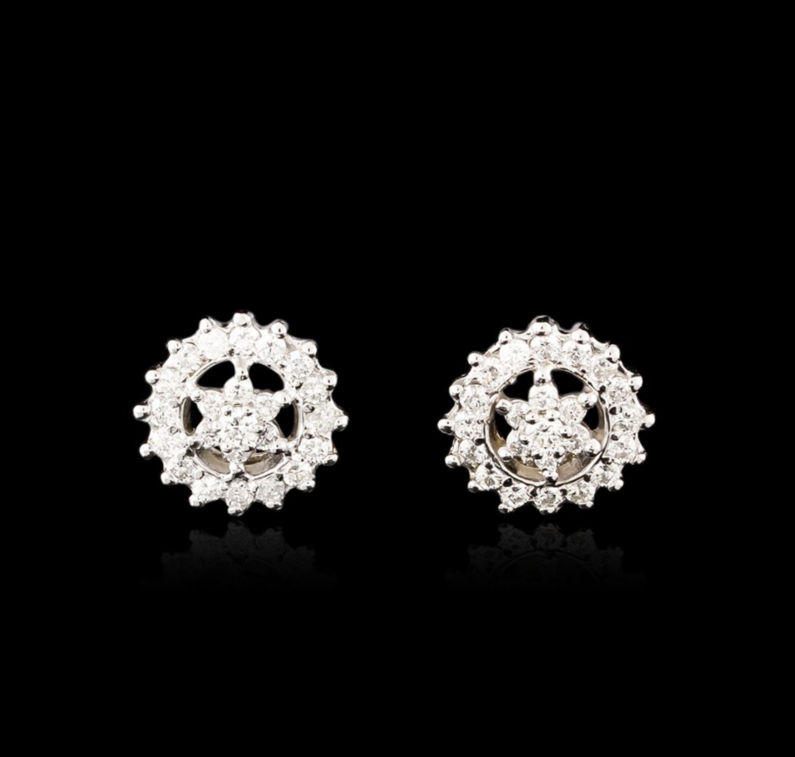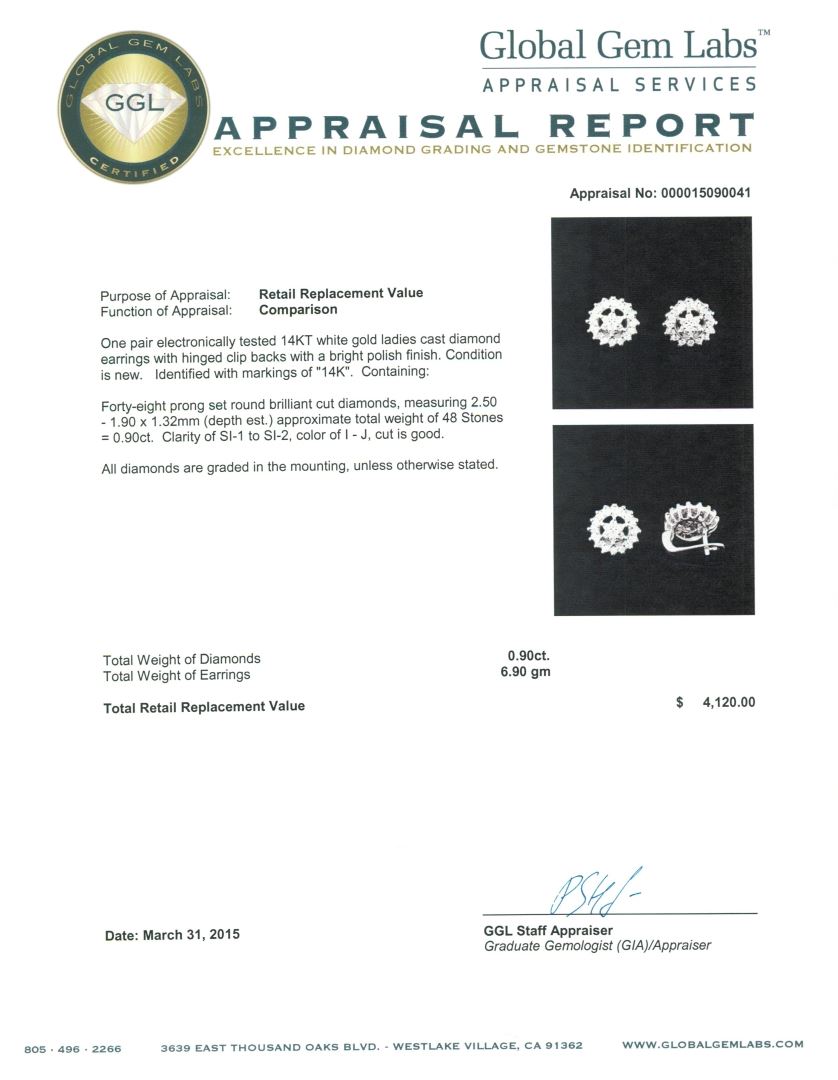 One pair electronically tested 14KT white gold ladies cast diamond earrings with hinged clip backs with a bright polish finish. Identified with markings of "14K". Condition is new. Containing: Forty-Eight prong set round brilliant cut diamonds, measuring 2.50 - 1.90 x 1.32mm (depth est.) approximate total weight of 48 Stones = 0.90ct. Clarity: SI-1 to SI-2. Color: I - J, Cut is Good. All diamonds are graded in the mounting, unless otherwise stated. Total Weight of Diamonds 0.90ct. Total Weight of Earrings 6.90 grams. GGL Appraised at $4,120.00.