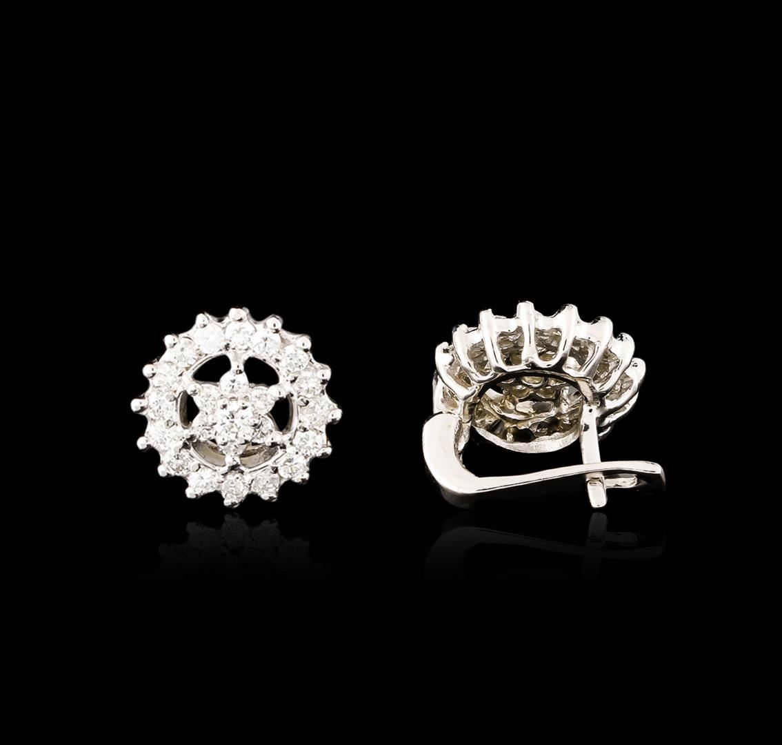 One pair electronically tested 14KT white gold ladies cast diamond earrings with hinged clip backs with a bright polish finish. Identified with markings of "14K". Condition is new. Containing: Forty-Eight prong set round brilliant cut diamonds, measuring 2.50 - 1.90 x 1.32mm (depth est.) approximate total weight of 48 Stones = 0.90ct. Clarity: SI-1 to SI-2. Color: I - J, Cut is Good. All diamonds are graded in the mounting, unless otherwise stated. Total Weight of Diamonds 0.90ct. Total Weight of Earrings 6.90 grams. GGL Appraised at $4,120.00.