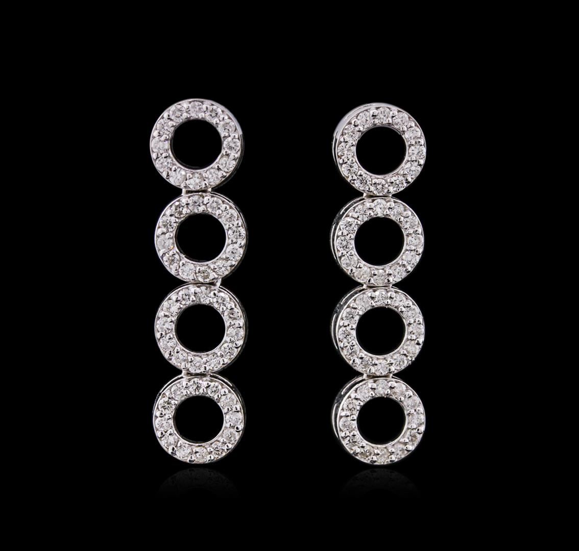 One pair electronically tested 14KT white gold ladies cast diamond earrings with friction posts with a bright polish finish. Identified with markings of "14K". Condition is new. Containing: One Hundred Twelve prong set round brilliant cut diamonds, measuring 1.30 - 1.30 x 0.78mm (depth est.) approximate total weight of 112 Stones = 0.90ct. Clarity: SI-1 to SI-2. Color: I - J, Cut is Good. All diamonds are graded in the mounting, unless otherwise stated. Total Weight of Diamonds 0.90ct. Total Weight of Earrings 5.10 grams. GGL Appraised at $2,760.00.